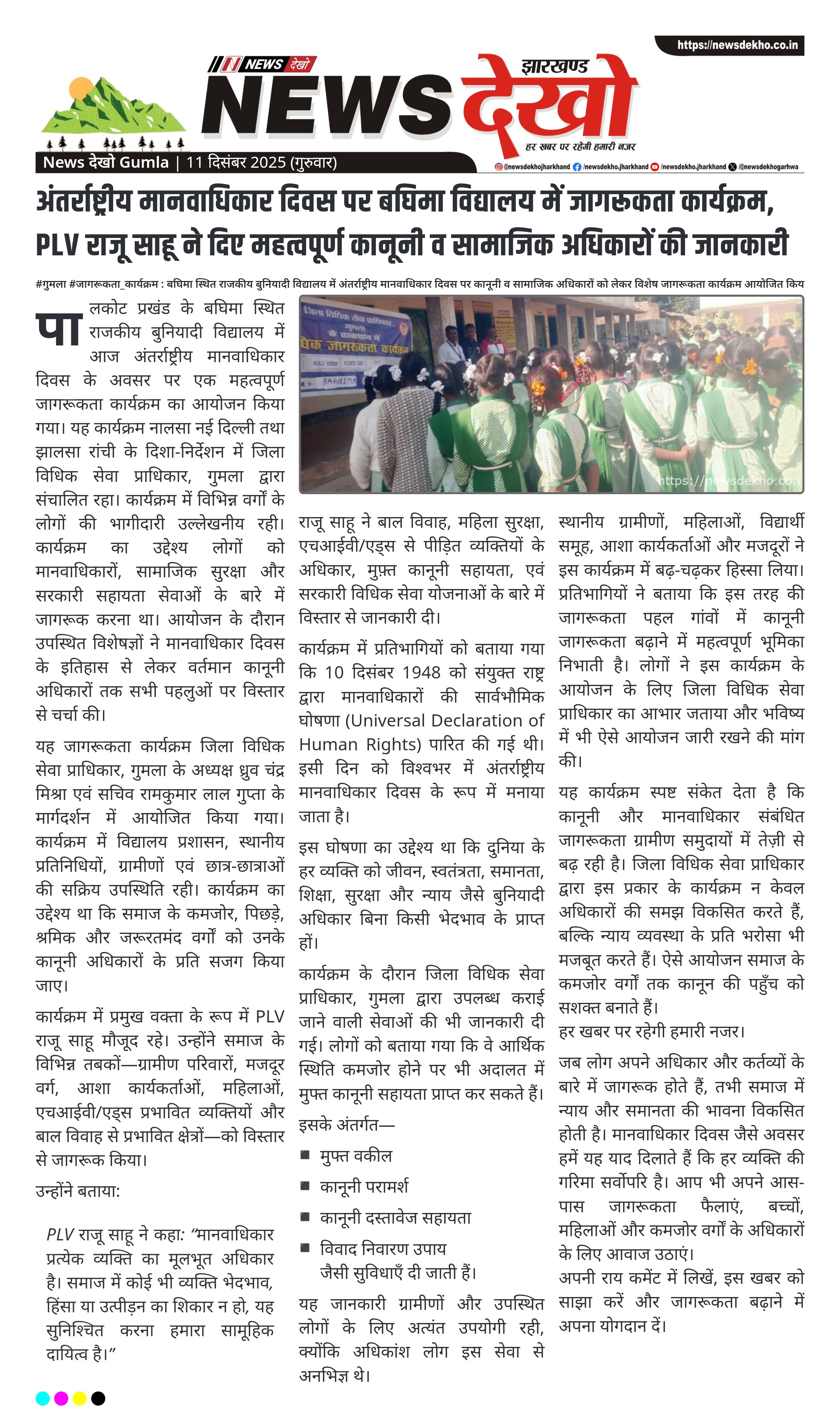 #गुमला #जागरूकता_कार्यक्रम : बघिमा स्थित राजकीय बुनियादी विद्यालय में अंतर्राष्ट्रीय मानवाधिकार दिवस पर कानूनी व सामाजिक अधिकारों को लेकर विशेष जागरूकता कार्यक्रम आयोजित किया गया। बघिमा विद्यालय में जिला विधिक सेवा प्राधिकार, गुमला द्वारा जागरूकता कार्यक्रम आयोजित। ध्रुव चंद्र मिश्रा और रामकुमार लाल गुप्ता के मार्गदर्शन में कार्यक्रम सम्पन्न हुआ।…