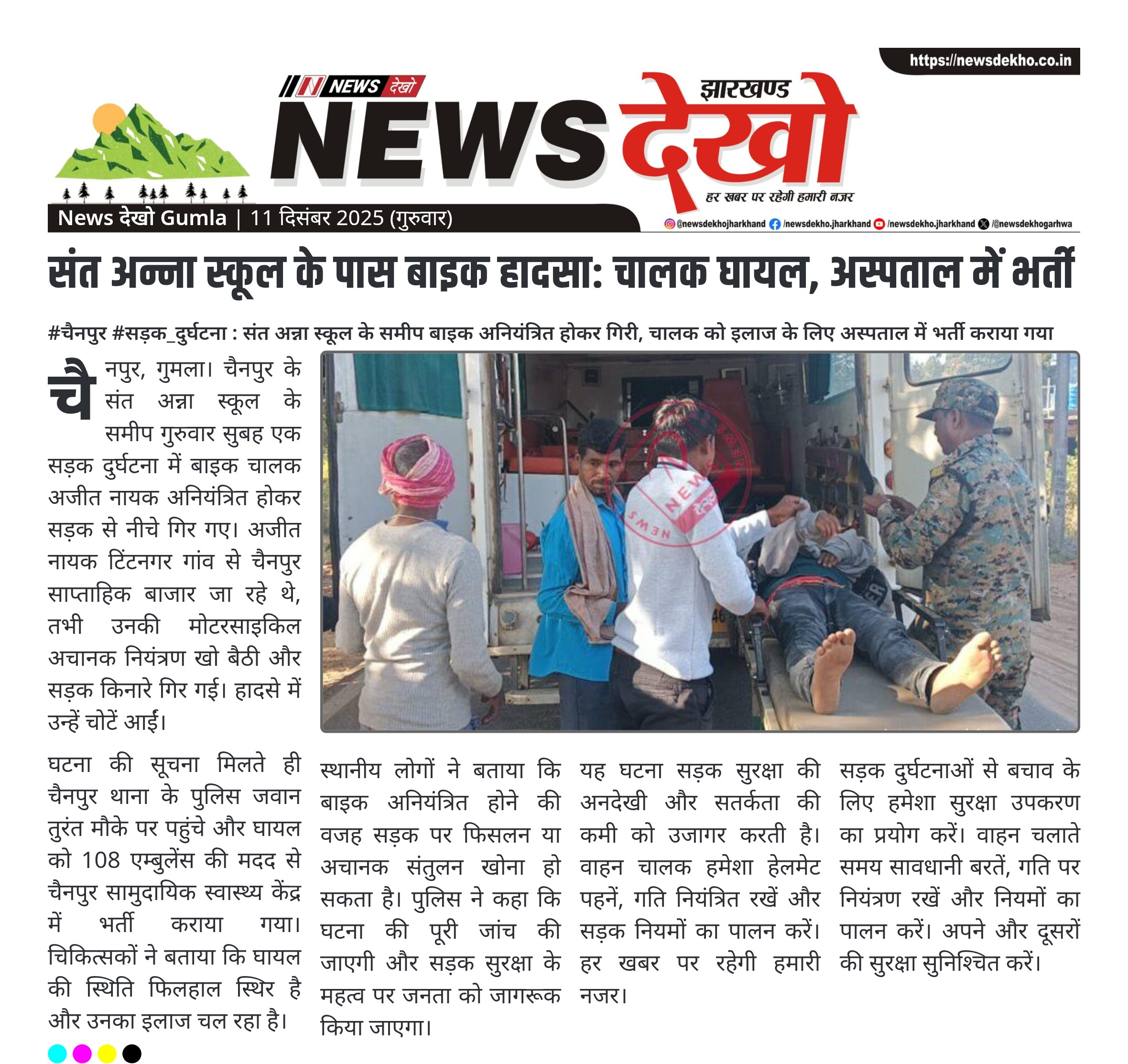 #चैनपुर #सड़क_दुर्घटना : संत अन्ना स्कूल के समीप बाइक अनियंत्रित होकर गिरी, चालक को इलाज के लिए अस्पताल में भर्ती कराया गया चैनपुर के संत अन्ना स्कूल के पास बाइक अनियंत्रित होकर सड़क किनारे गिरी। बाइक चालक अजीत नायक (टिंटनगर) घायल हुआ। दुर्घटना सुबह के समय हुई, जब वह साप्ताहिक…