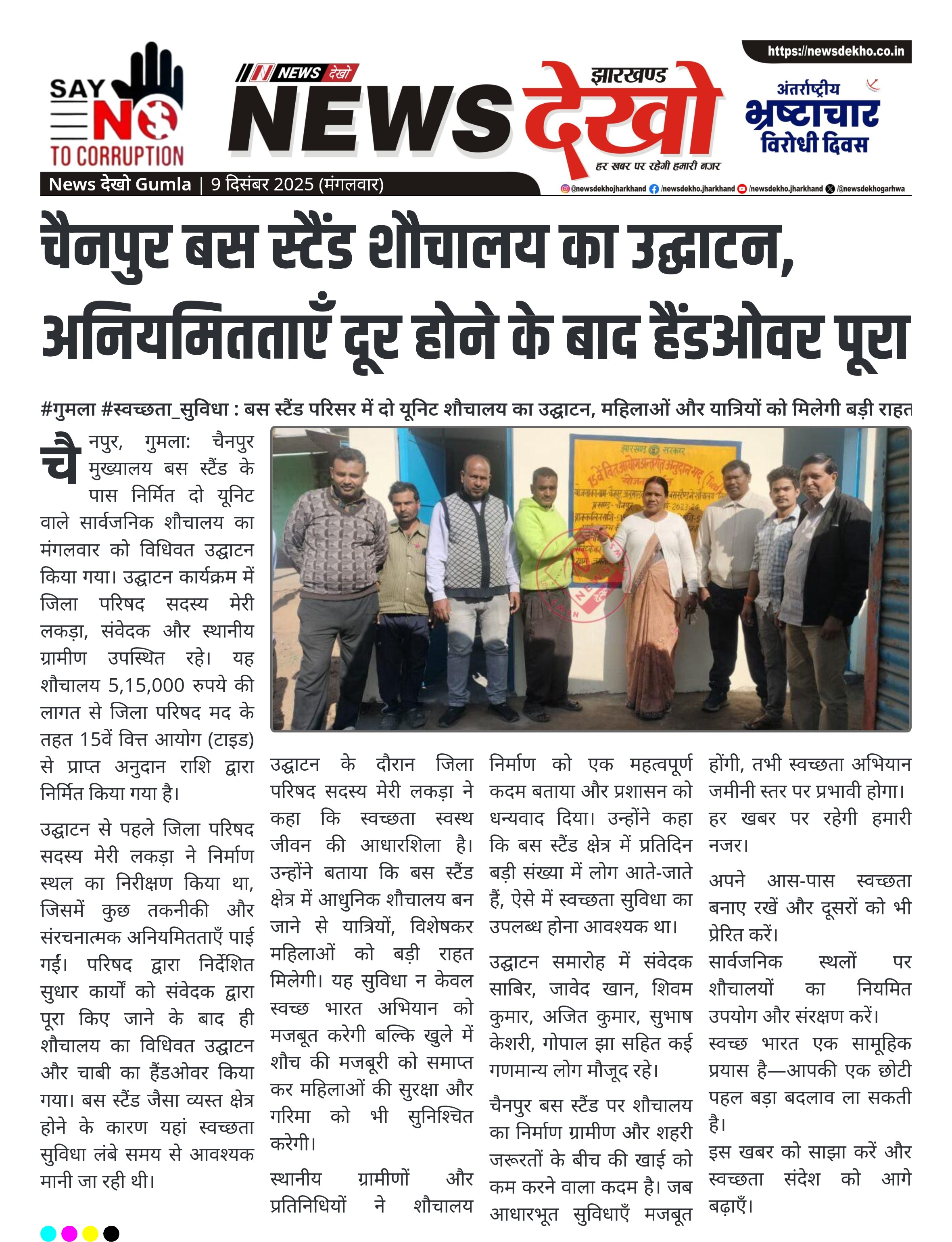 #गुमला #स्वच्छता_सुविधा : बस स्टैंड परिसर में दो यूनिट शौचालय का उद्घाटन, महिलाओं और यात्रियों को मिलेगी बड़ी राहत दो यूनिट शौचालय का निर्माण 5.15 लाख रुपये की लागत से हुआ। जिला परिषद मद से 15वें वित्त आयोग (टाइड) अंतर्गत बनाया गया। निरीक्षण में मिली अनियमितताएँ सुधारने के बाद हैंडओवर…