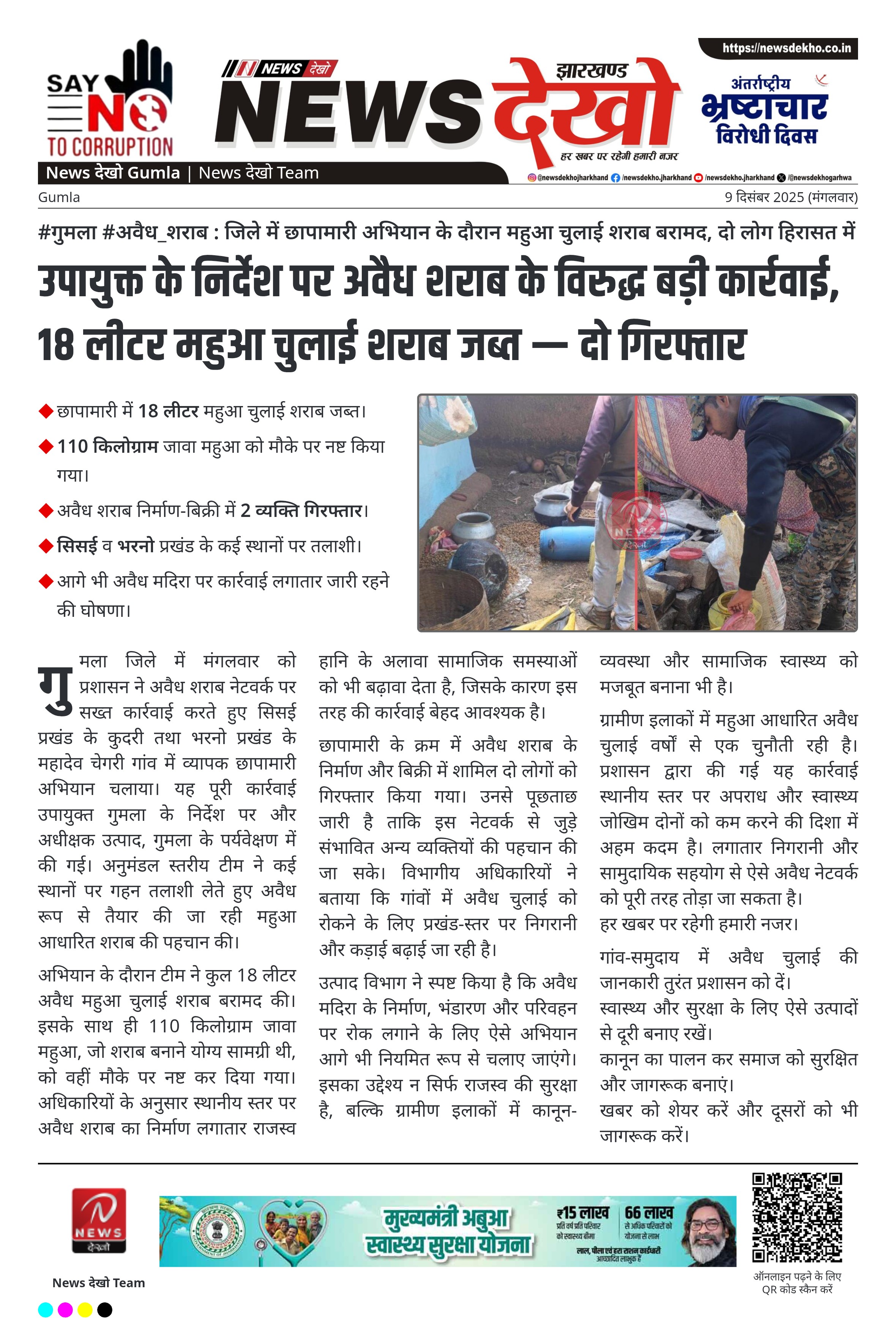 #गुमला #अवैध_शराब : जिले में छापामारी अभियान के दौरान महुआ चुलाई शराब बरामद, दो लोग हिरासत में छापामारी में 18 लीटर महुआ चुलाई शराब जब्त। 110 किलोग्राम जावा महुआ को मौके पर नष्ट किया गया। अवैध शराब निर्माण-बिक्री में 2 व्यक्ति गिरफ्तार। सिसई व भरनो प्रखंड के कई स्थानों पर…