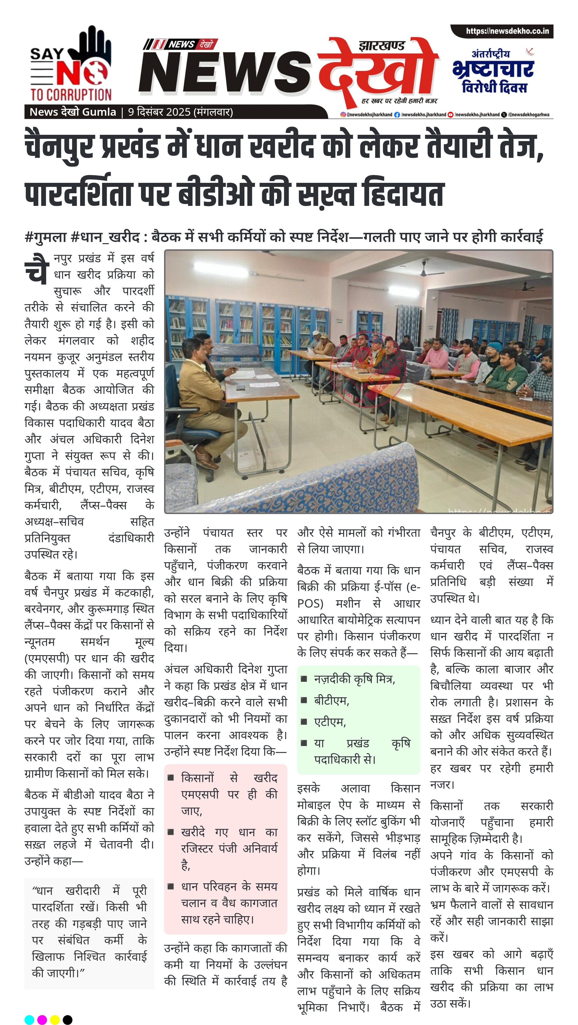 #गुमला #धान_खरीद : बैठक में सभी कर्मियों को स्पष्ट निर्देश—गलती पाए जाने पर होगी कार्रवाई प्रखंड स्तरीय बैठक में धान खरीद तैयारी की समीक्षा। तीन लैंप्स–पैक्स केंद्रों पर एमएसपी पर खरीद सुनिश्चित। कर्मियों को पारदर्शिता के साथ काम करने का निर्देश। किसानों को पंजीकरण व सरकारी दरों का लाभ लेने…