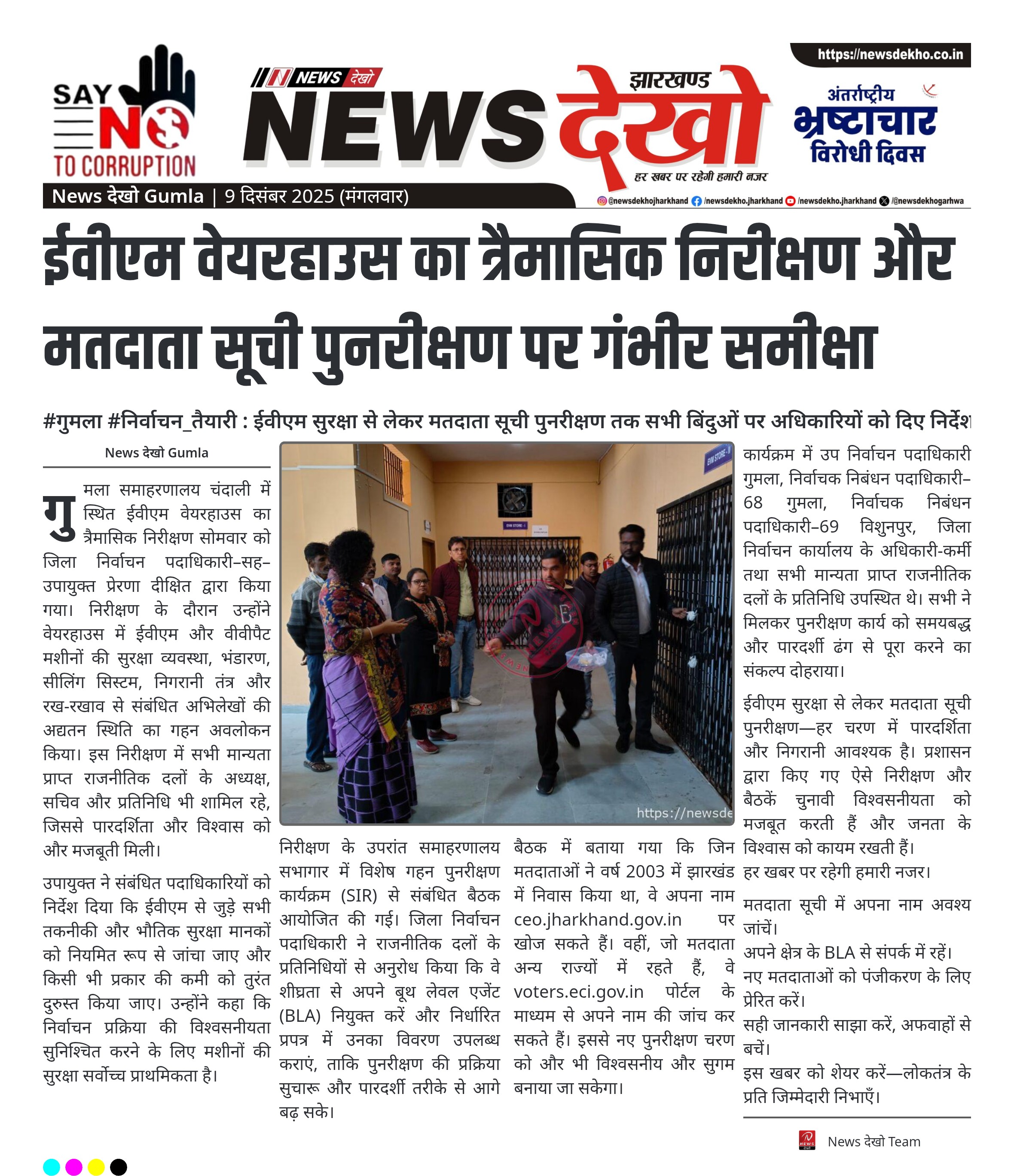 #गुमला #निर्वाचन_तैयारी : ईवीएम सुरक्षा से लेकर मतदाता सूची पुनरीक्षण तक सभी बिंदुओं पर अधिकारियों को दिए निर्देश जिला निर्वाचन पदाधिकारी–सह–उपायुक्त प्रेरणा दीक्षित ने किया ईवीएम वेयरहाउस का त्रैमासिक निरीक्षण। ईवीएम की सुरक्षा, रख-रखाव और अभिलेख अद्यतन की विस्तृत समीक्षा। राजनीतिक दलों के प्रतिनिधि निरीक्षण में उपस्थित रहे। मतदाता सूची…
