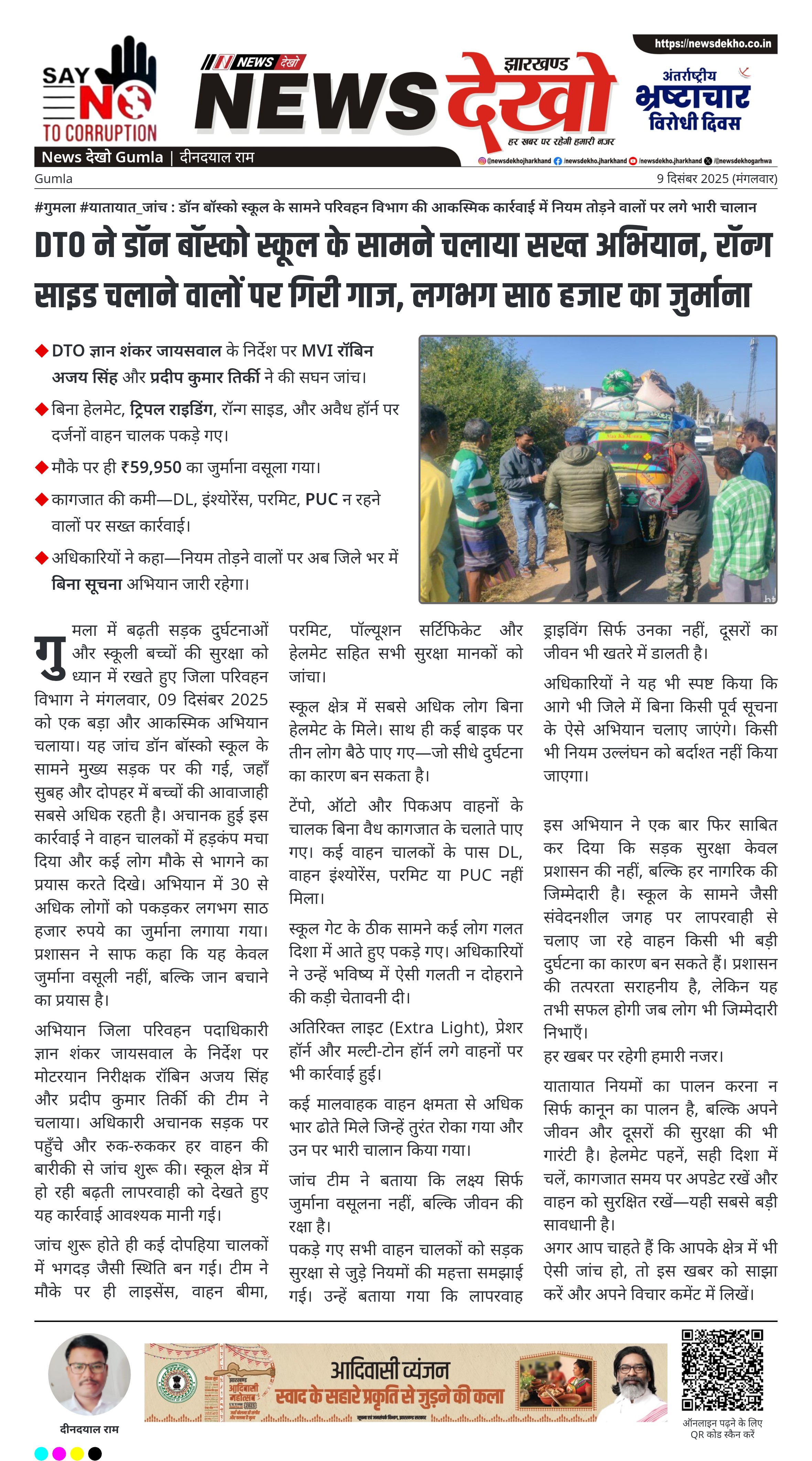 #गुमला #स्कूलबस_जांच : बच्चों की सुरक्षा मानकों के उल्लंघन पर परिवहन विभाग ने AG Church School की बसों पर भारी जुर्माना लगाया। AG Church School की बसों पर ₹60,000 का जुर्माना लगाया गया। एक्सपायर्ड फायर एक्सटिंग्विशर और गायब CCTV–GPS पाए गए। कई बसों में परमिट, फिटनेस, इंश्योरेंस सहित कागजात अधूरे…