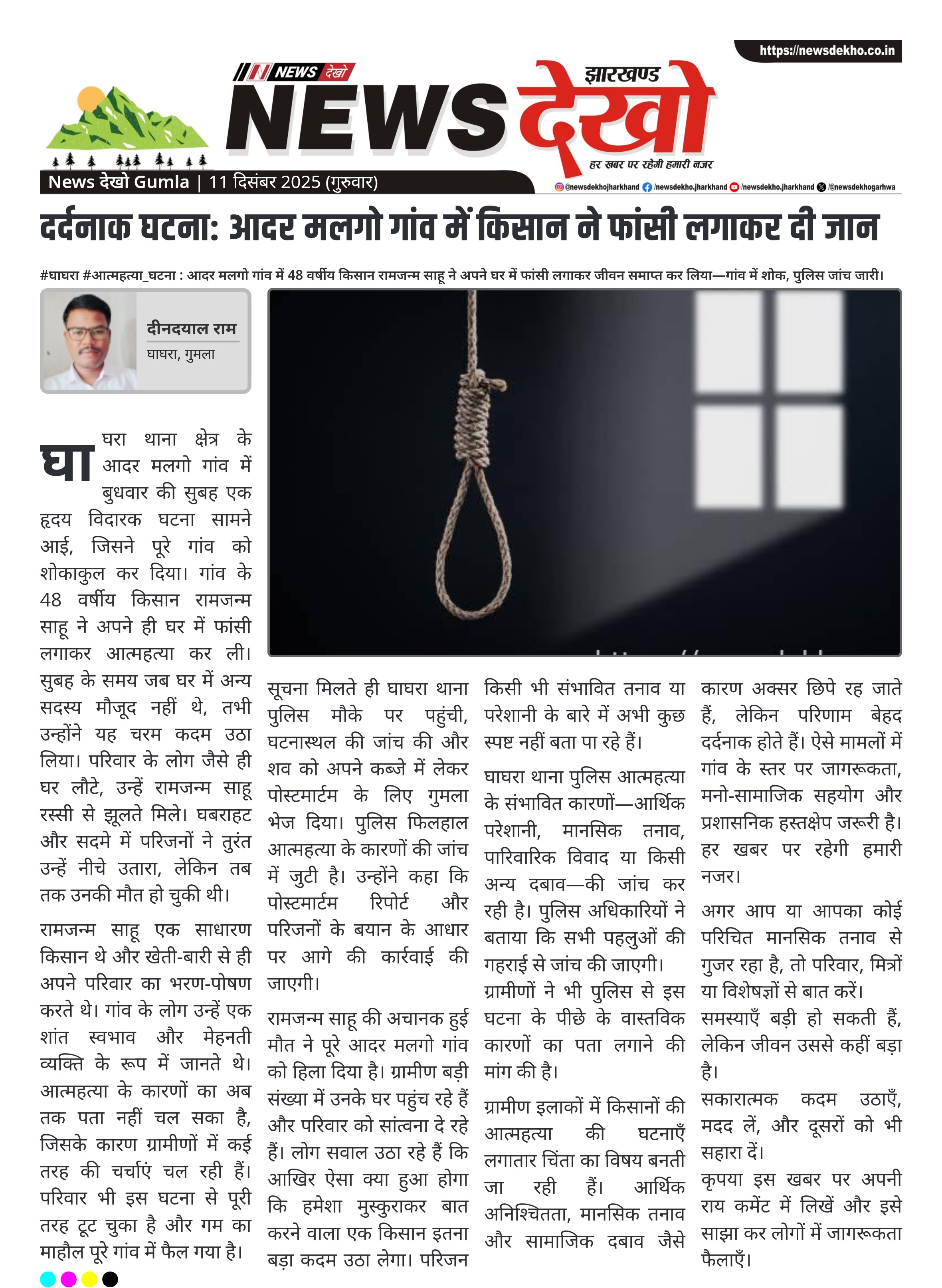 #घाघरा #आत्महत्या_घटना : आदर मलगो गांव में 48 वर्षीय किसान रामजन्म साहू ने अपने घर में फांसी लगाकर जीवन समाप्त कर लिया—गांव में शोक, पुलिस जांच जारी। 48 वर्षीय किसान रामजन्म साहू ने की आत्महत्या। सुबह घर में अकेले होने के दौरान उठाया कदम। परिजनों ने रस्सी से झूलते देखा,…