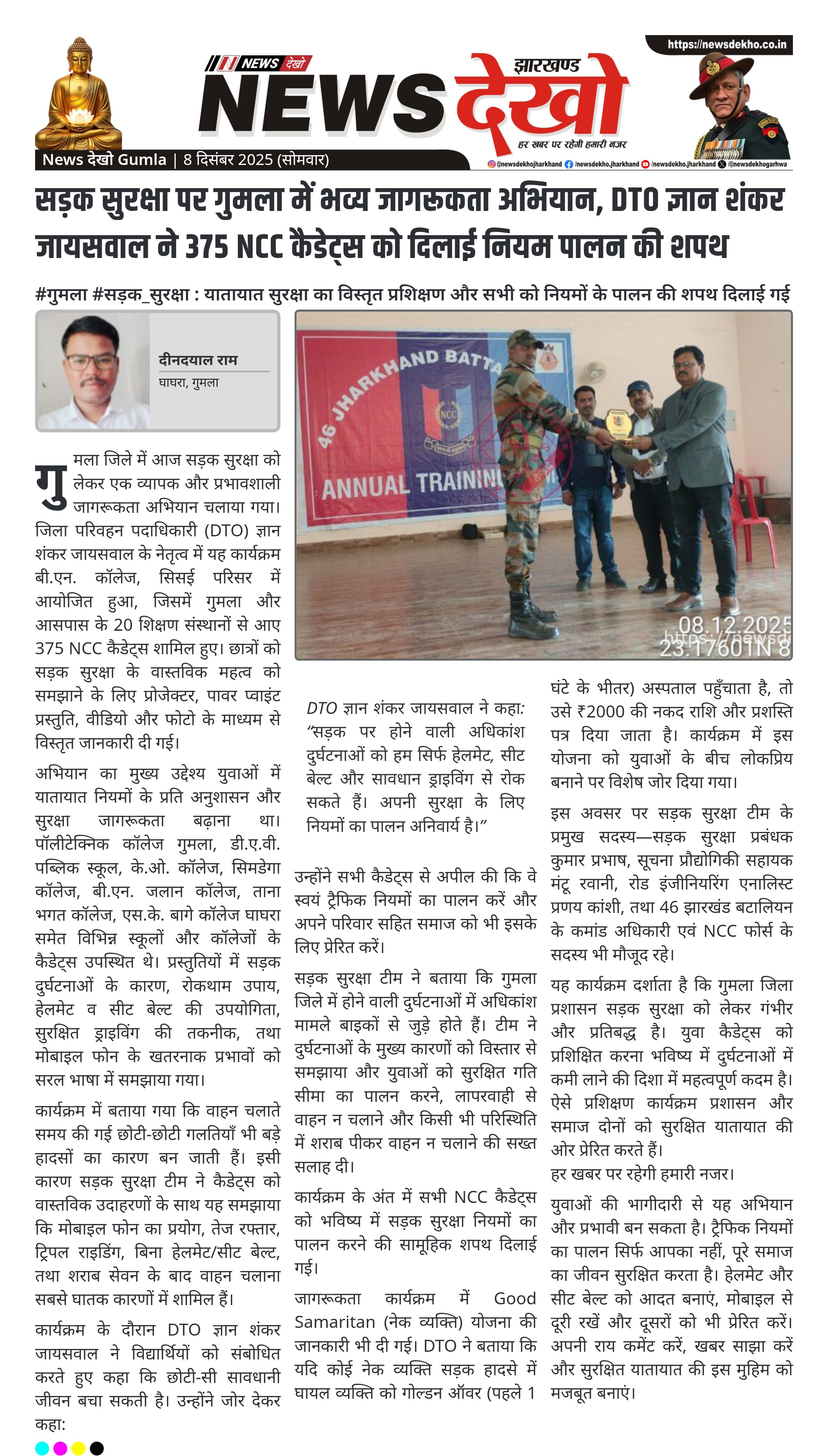 सड़क सुरक्षा पर गुमला में भव्य जागरूकता अभियान, DTO ज्ञान शंकर जायसवाल ने 375 NCC कैडेट्स को दिलाई नियम पालन की शपथ