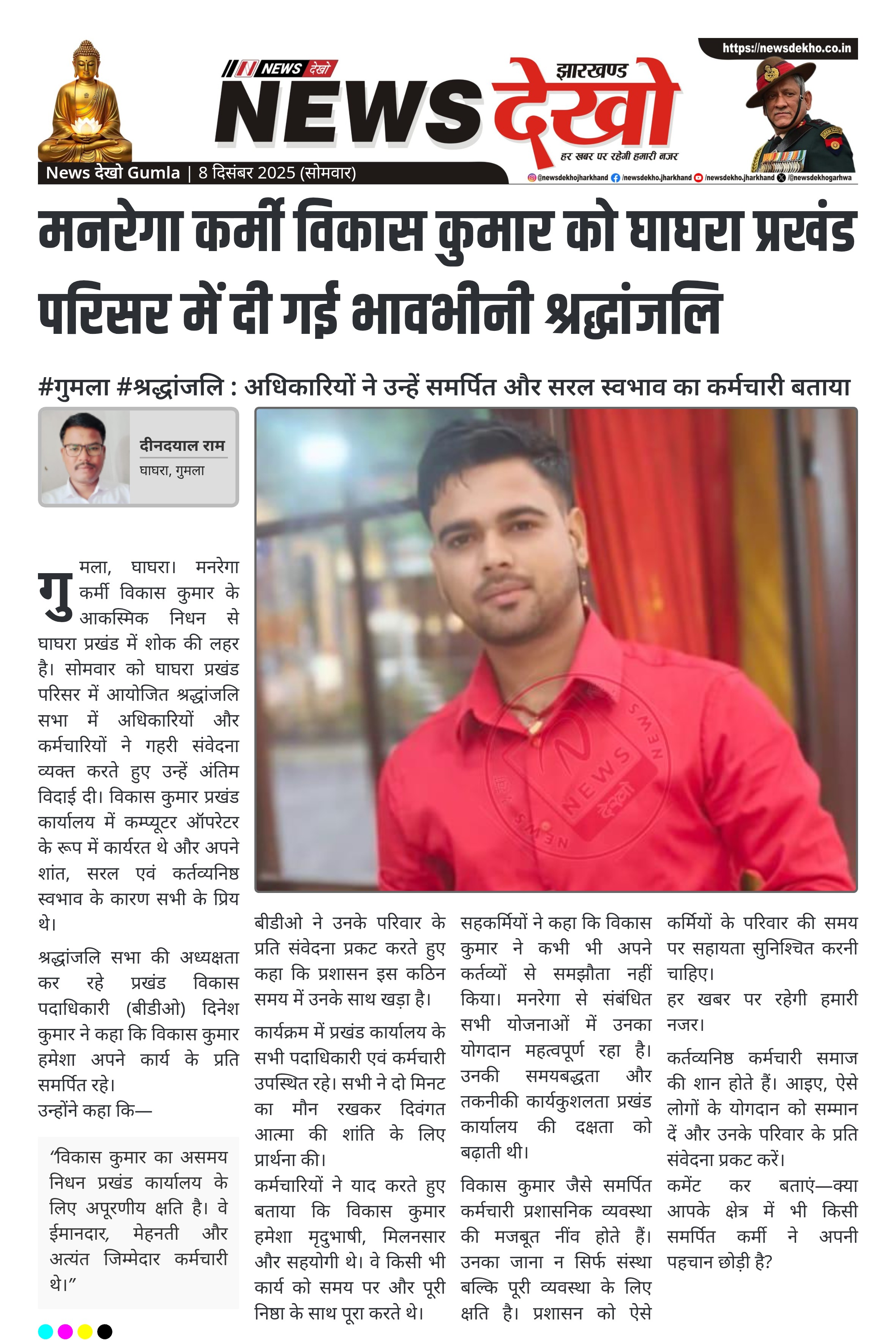 #गुमला #श्रद्धांजलि : अधिकारियों ने उन्हें समर्पित और सरल स्वभाव का कर्मचारी बताया घाघरा प्रखंड परिसर में शोक सभा का आयोजन। दिवंगत विकास कुमार मनरेगा में कम्प्यूटर ऑपरेटर पद पर कार्यरत थे। बीडीओ दिनेश कुमार की अध्यक्षता में कर्मचारियों द्वारा श्रद्धांजलि। दो मिनट का मौन, परिवार के प्रति संवेदना व्यक्त।…