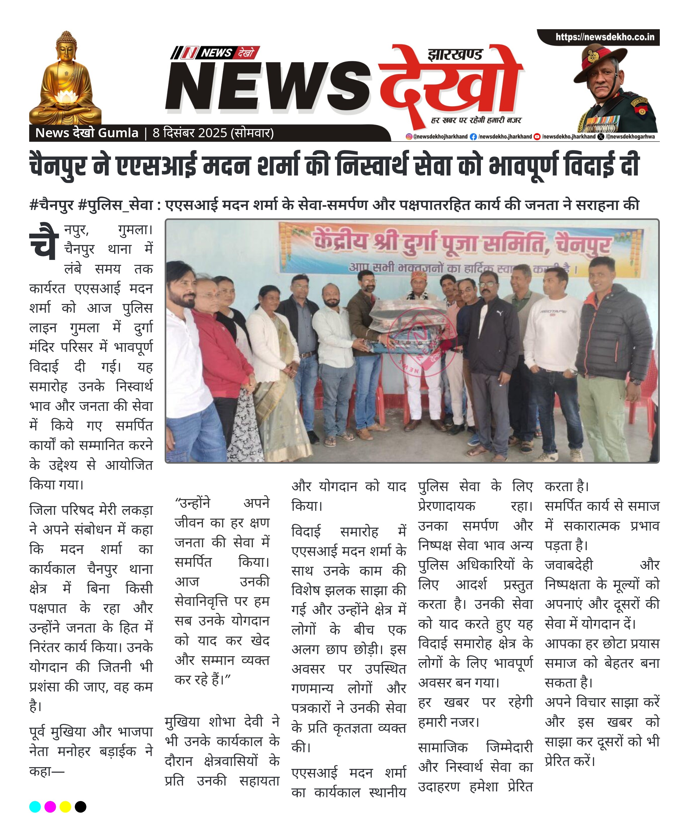 #चैनपुर #पुलिस_सेवा : एएसआई मदन शर्मा के सेवा-समर्पण और पक्षपातरहित कार्य की जनता ने सराहना की एएसआई मदन शर्मा को दुर्गा मंदिर परिसर में विदाई दी गई। सम्मान में उन्हें पुष्पगुच्छ और शॉल भेंट किया गया। कार्यक्रम में जिला परिषद मेरी लकड़ा, मुखिया शोभा देवी, पूर्व मुखिया मनोहर बड़ाईक, अवधेश…
