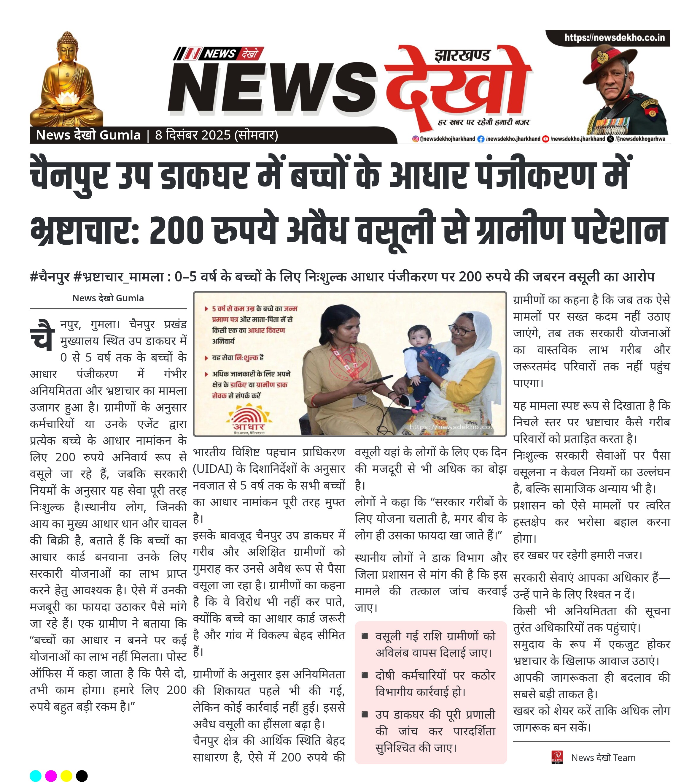 #चैनपुर #भ्रष्टाचार_मामला : 0–5 वर्ष के बच्चों के लिए निःशुल्क आधार पंजीकरण पर 200 रुपये की जबरन वसूली का आरोप 0–5 वर्ष के बच्चों का आधार पंजीकरण पूरी तरह निःशुल्क, फिर भी 200 रुपये वसूले जाने की शिकायत। चैनपुर उप डाकघर के कर्मचारी/एजेंट पर अवैध वसूली का आरोप। गरीब ग्रामीणों…
