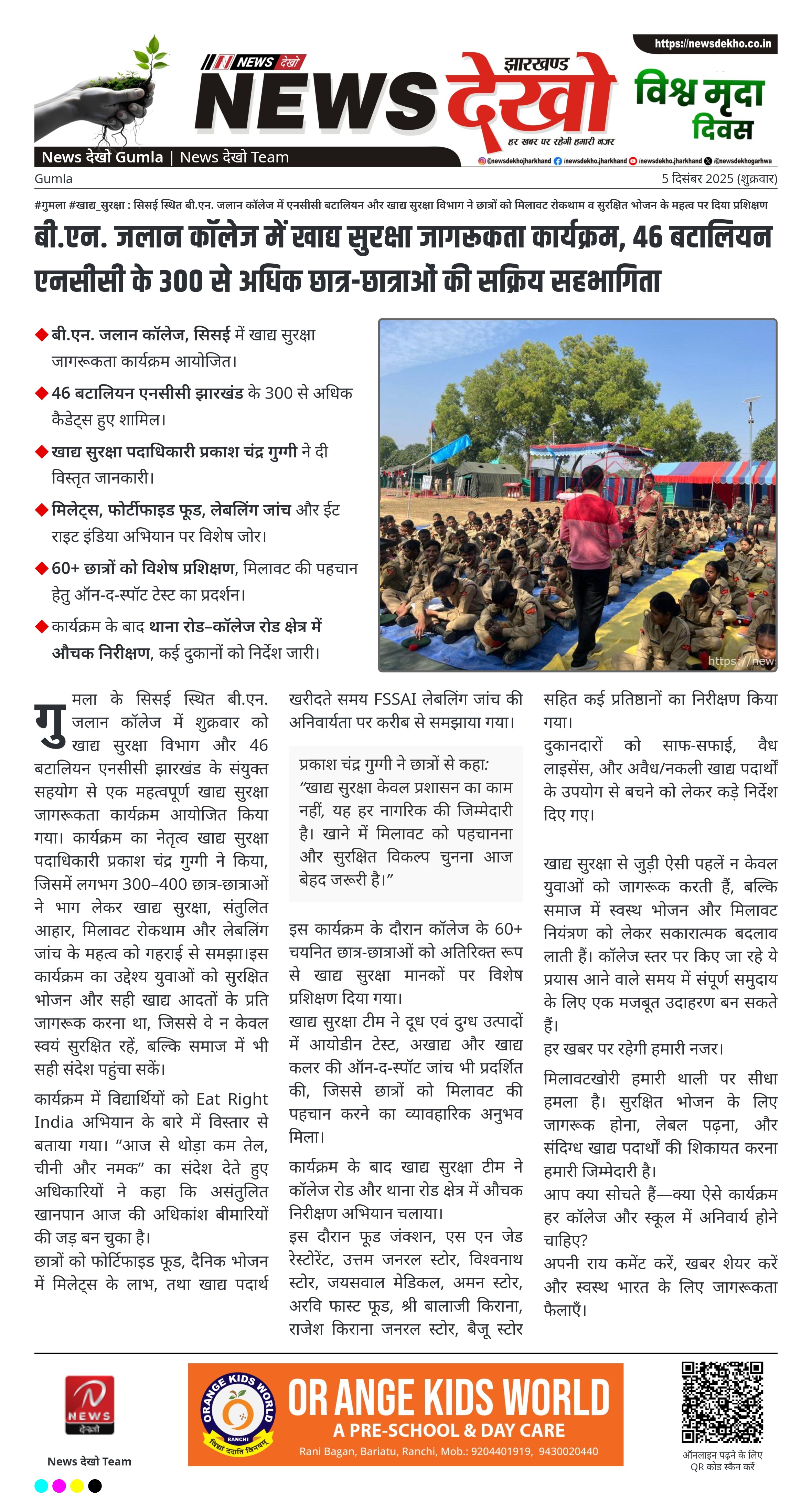 #गुमला #खाद्य_सुरक्षा : सिसई स्थित बी.एन. जलान कॉलेज में एनसीसी बटालियन और खाद्य सुरक्षा विभाग ने छात्रों को मिलावट रोकथाम व सुरक्षित भोजन के महत्व पर दिया प्रशिक्षण बी.एन. जलान कॉलेज, सिसई में खाद्य सुरक्षा जागरूकता कार्यक्रम आयोजित। 46 बटालियन एनसीसी झारखंड के 300 से अधिक कैडेट्स हुए शामिल। खाद्य…