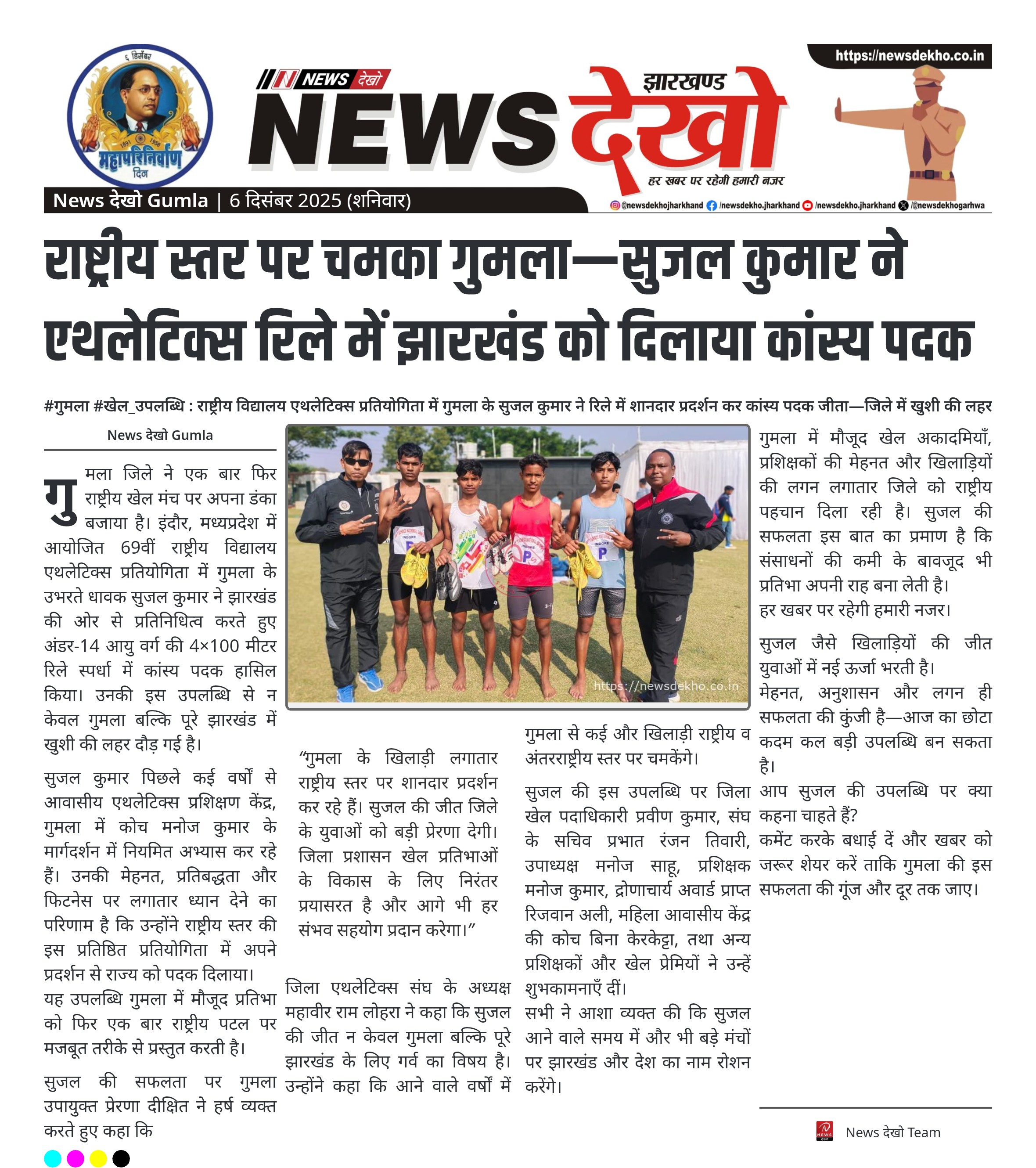 राष्ट्रीय स्तर पर चमका गुमला—सुजल कुमार ने एथलेटिक्स रिले में झारखंड को दिलाया कांस्य पदक