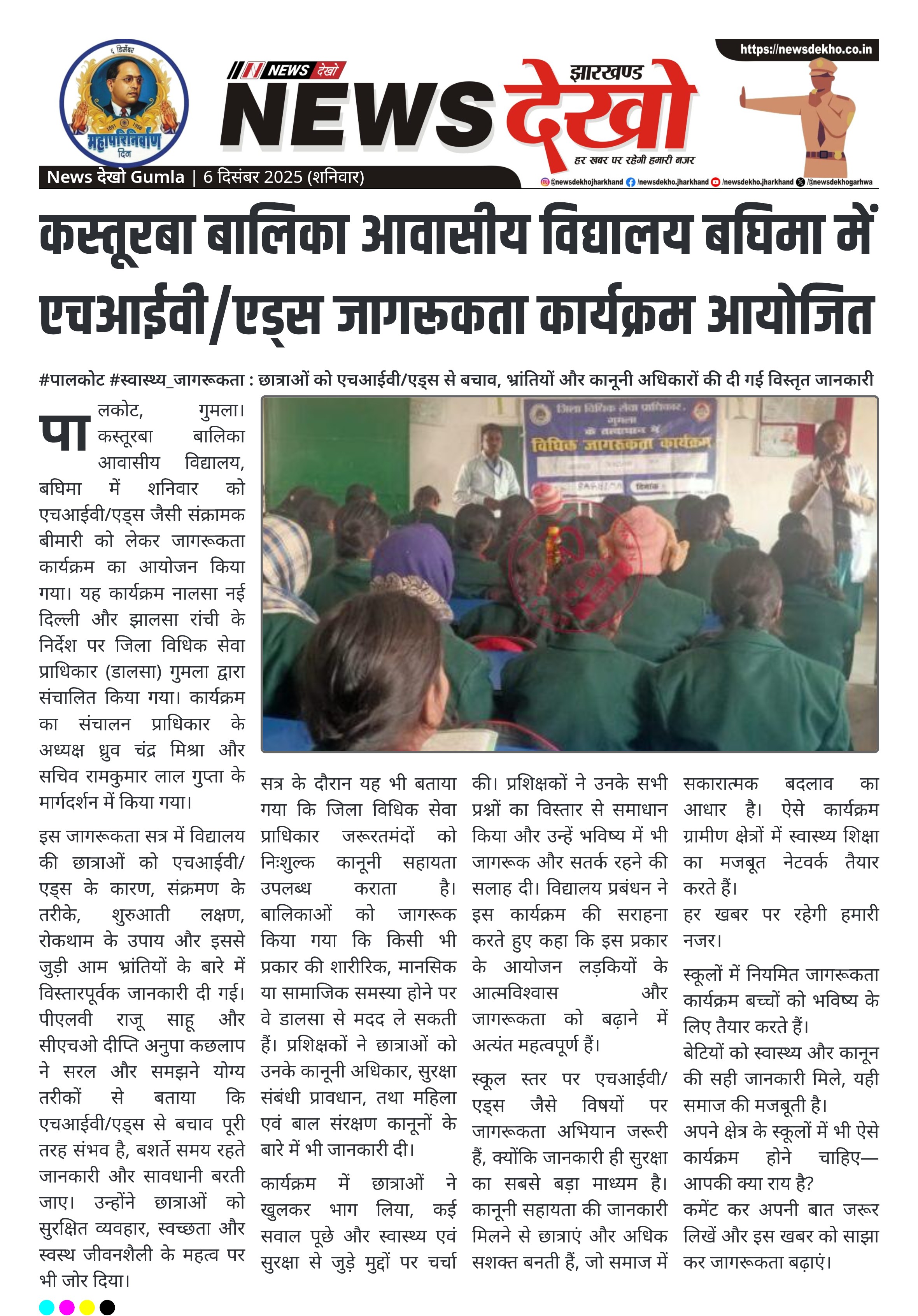 #पालकोट #स्वास्थ्य_जागरूकता : बघिमा स्थित कस्तूरबा विद्यालय में नालसा–झालसा के निर्देश पर एचआईवी/एड्स से बचाव हेतु विशेष जागरूकता सत्र आयोजित किया गया। कस्तूरबा बालिका आवासीय विद्यालय, बघिमा में एचआईवी/एड्स जागरूकता कार्यक्रम आयोजित। कार्यक्रम नालसा नई दिल्ली, झालसा रांची और जिला विधिक सेवा प्राधिकार, गुमला के संयुक्त निर्देशन में हुआ। संचालन…