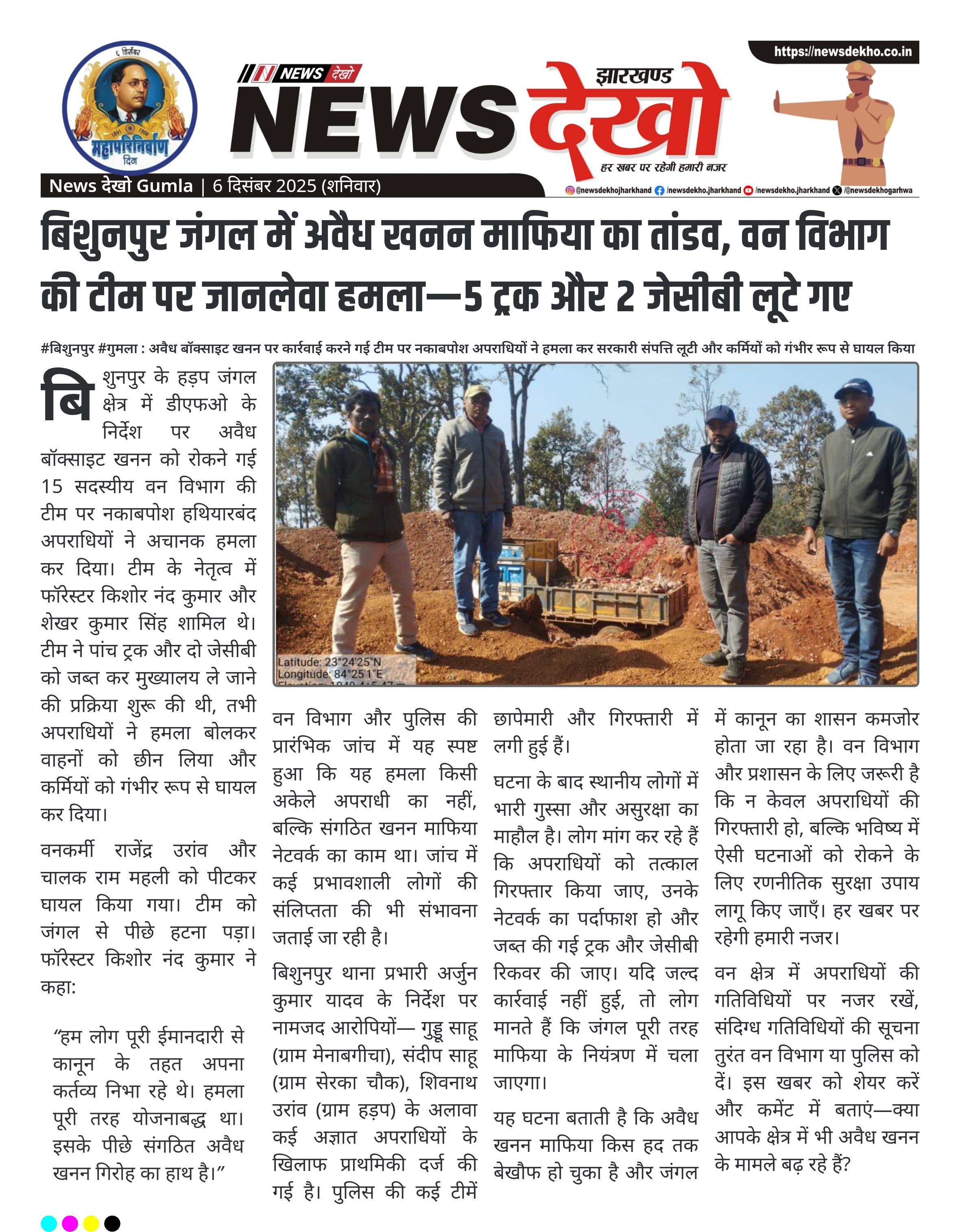 बिशुनपुर जंगल में अवैध खनन माफिया का तांडव, वन विभाग की टीम पर जानलेवा हमला—5 ट्रक और 2 जेसीबी लूटे गए