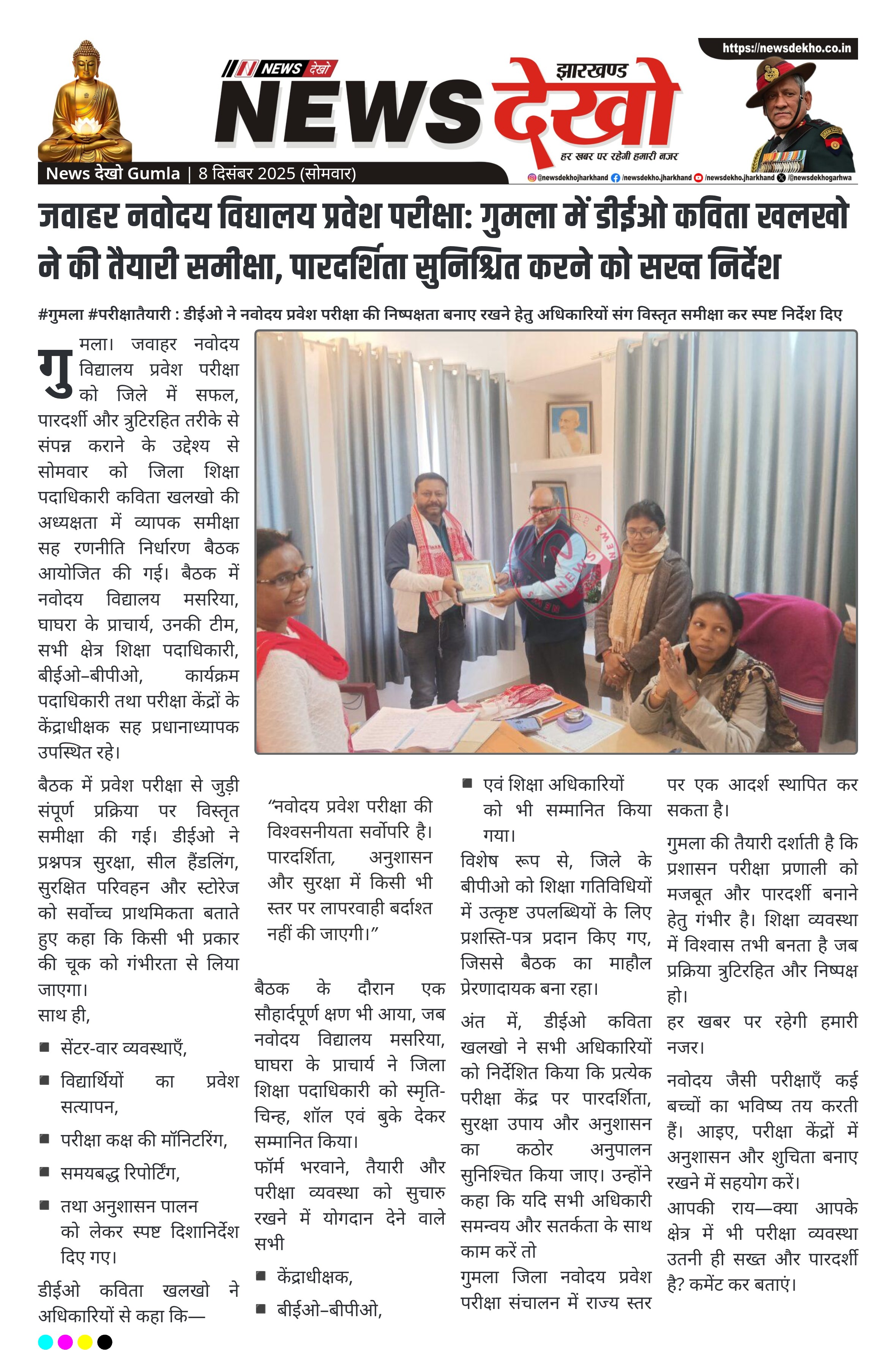 #गुमला #परीक्षातैयारी : डीईओ ने नवोदय प्रवेश परीक्षा की निष्पक्षता बनाए रखने हेतु अधिकारियों संग विस्तृत समीक्षा कर स्पष्ट निर्देश दिए डीईओ कविता खलखो की अध्यक्षता में समीक्षा सह रणनीति बैठक। नवोदय विद्यालय मसरिया, घाघरा के प्राचार्य सहित जिला स्तरीय शिक्षा अधिकारी सहभागी। प्रश्नपत्र सुरक्षा, प्रवेश सत्यापन और अनुशासन पर…