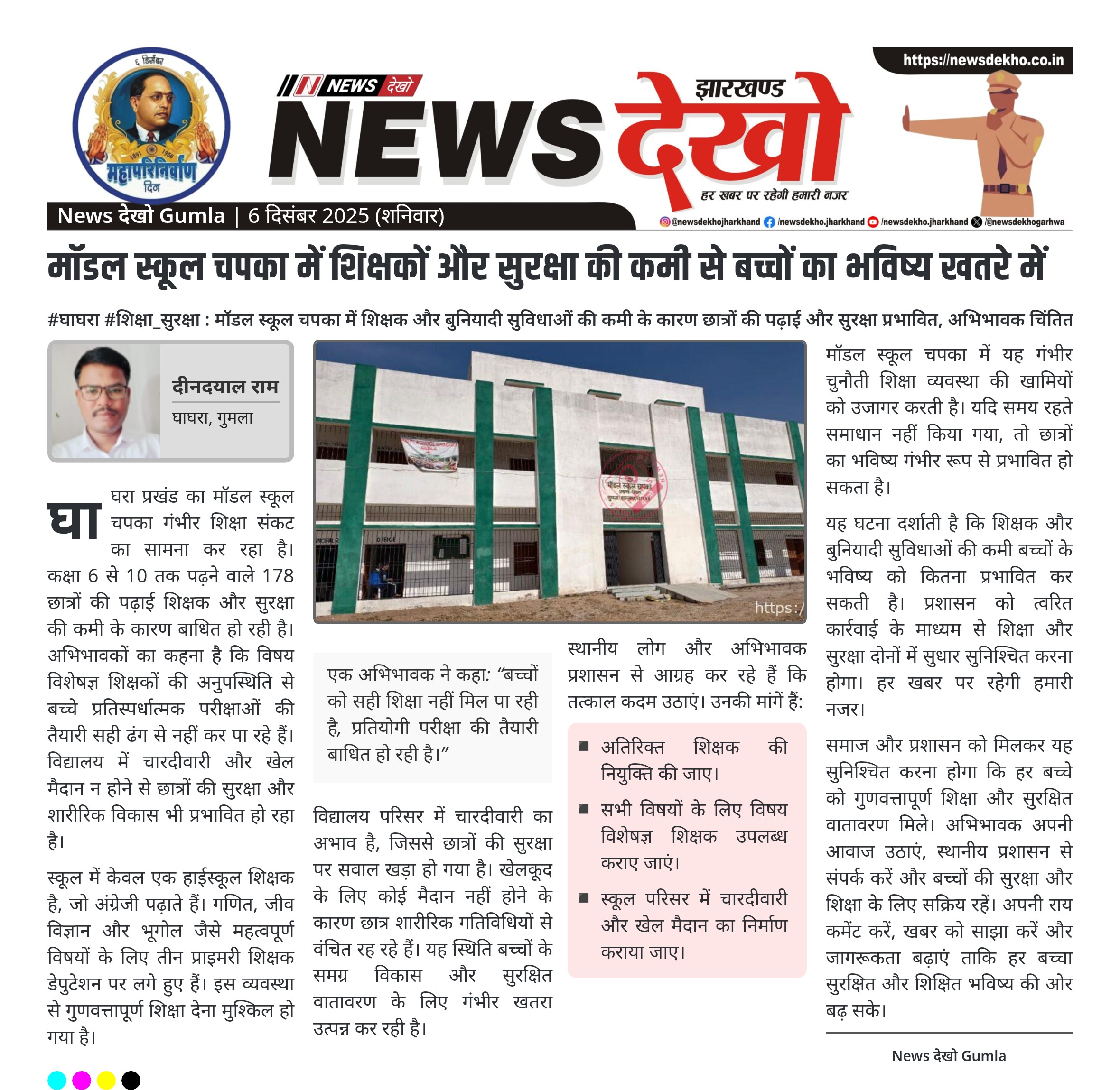 #घाघरा #शिक्षा_सुरक्षा : मॉडल स्कूल चपका में शिक्षक और बुनियादी सुविधाओं की कमी के कारण छात्रों की पढ़ाई और सुरक्षा प्रभावित, अभिभावक चिंतित मॉडल स्कूल चपका में 178 छात्र-छात्राएं नामांकित हैं। स्कूल में केवल एक हाईस्कूल शिक्षक अंग्रेजी पढ़ाते हैं। गणित, जीव विज्ञान और भूगोल के लिए तीन प्राइमरी शिक्षक…