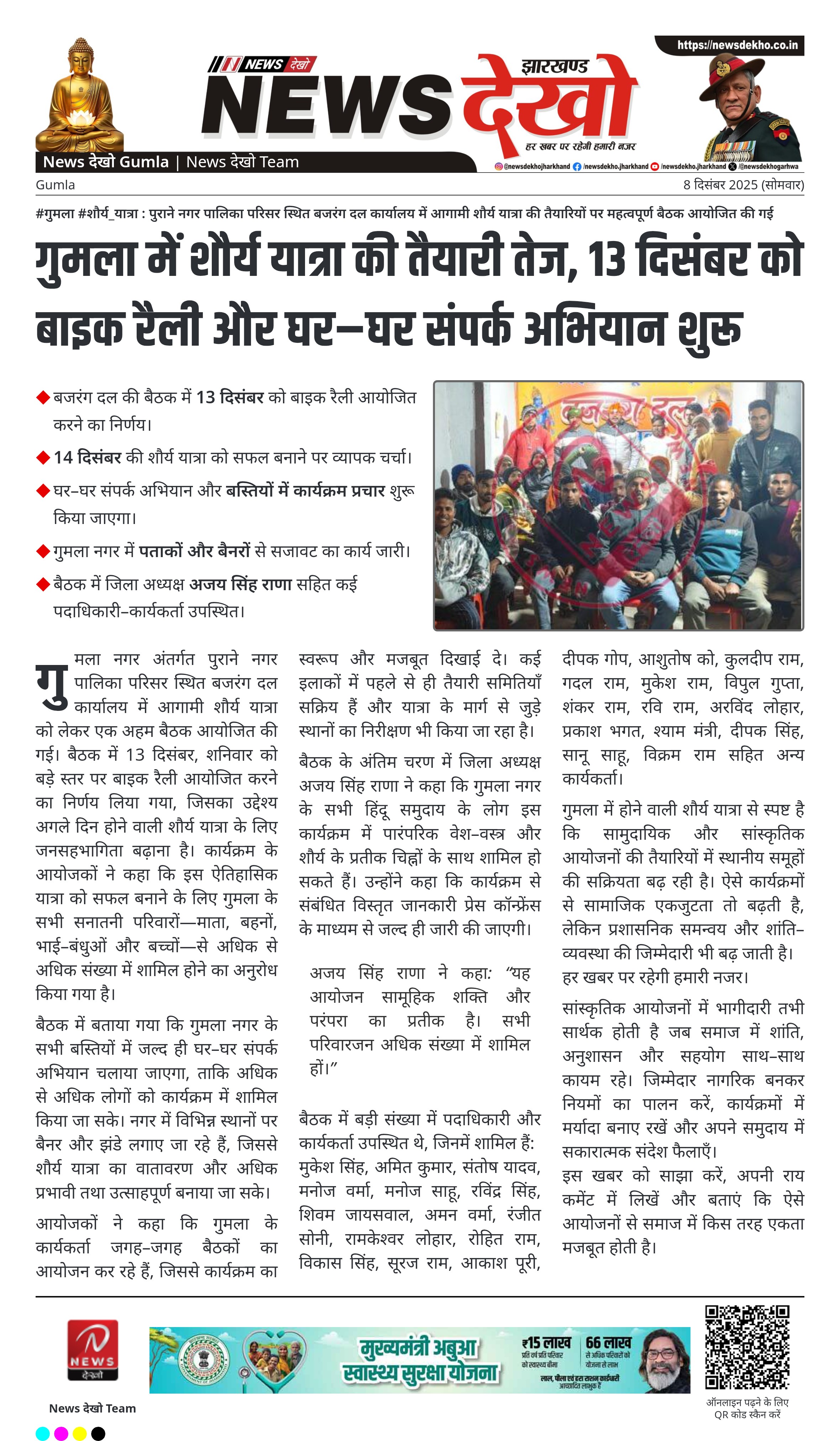 गुमला में शौर्य यात्रा की तैयारी तेज, 13 दिसंबर को बाइक रैली और घर–घर संपर्क अभियान शुरू
