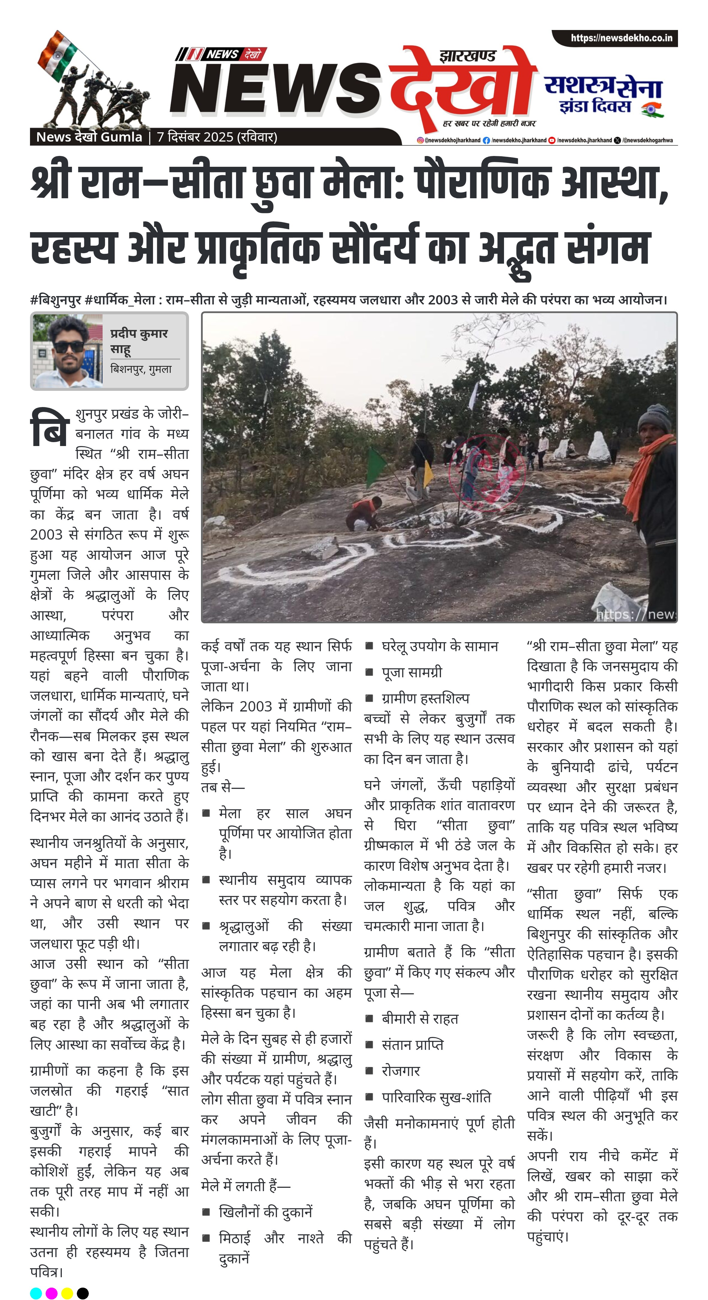 #बिशुनपुर #धार्मिक_मेला : राम–सीता से जुड़ी मान्यताओं, रहस्यमय जलधारा और 2003 से जारी मेले की परंपरा का भव्य आयोजन। बिशुनपुर प्रखंड के जोरी–बनालत के बीच बसे “श्री राम–सीता छुवा” में हर अघन पूर्णिमा को मेला। 2003 से लगातार आयोजित—स्थानीय ग्रामीणों की भूमिका महत्वपूर्ण। पौराणिक मान्यता: श्रीराम ने बाण से जलधारा…