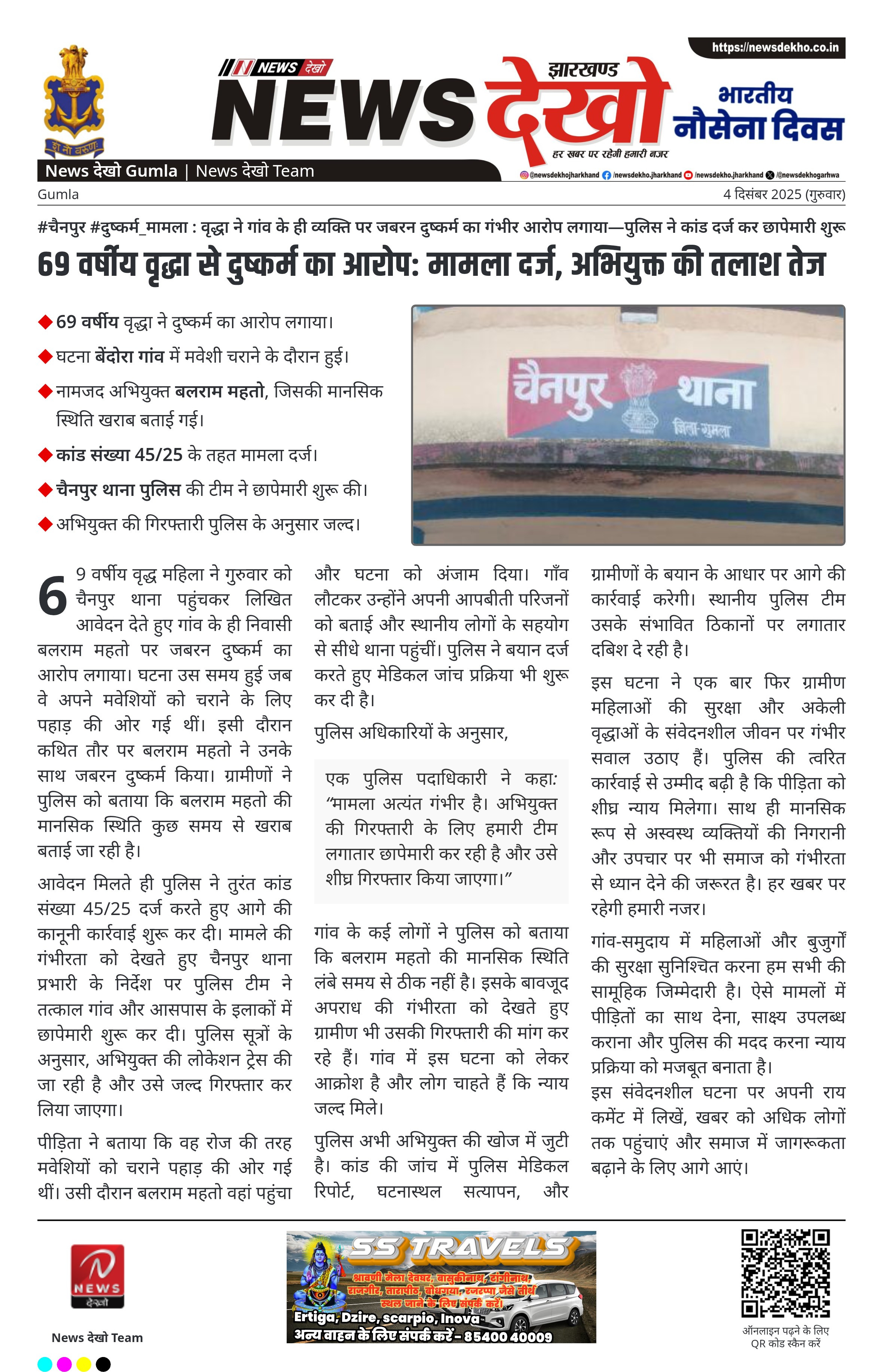 #चैनपुर #दुष्कर्म_मामला : वृद्धा ने गांव के ही व्यक्ति पर जबरन दुष्कर्म का गंभीर आरोप लगाया—पुलिस ने कांड दर्ज कर छापेमारी शुरू कर दी है। 69 वर्षीय वृद्धा ने दुष्कर्म का आरोप लगाया। घटना बेंदोरा गांव में मवेशी चराने के दौरान हुई। नामजद अभियुक्त बलराम महतो, जिसकी मानसिक स्थिति खराब…