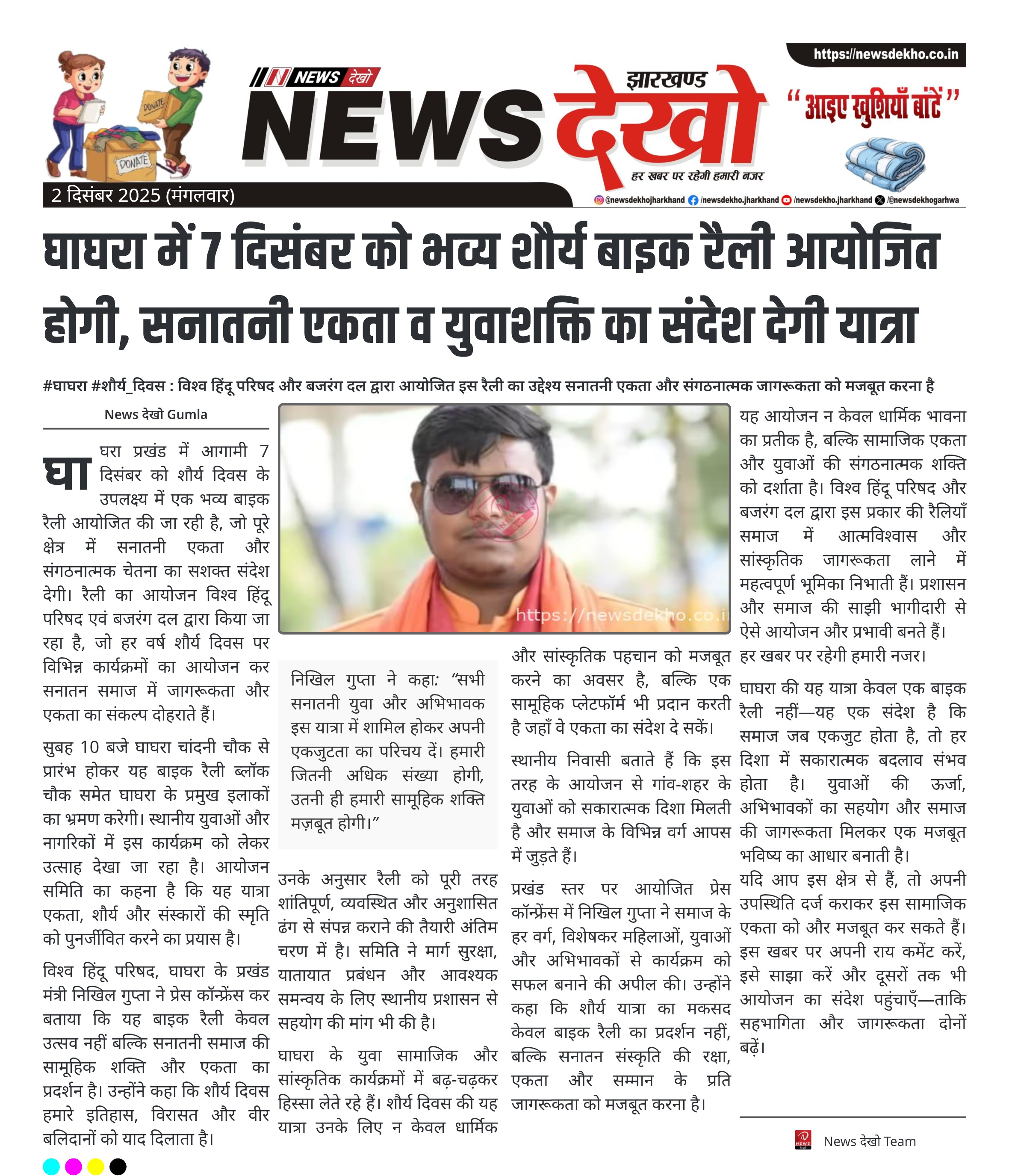 घाघरा में 7 दिसंबर को भव्य शौर्य बाइक रैली आयोजित होगी, सनातनी एकता व युवाशक्ति का संदेश देगी यात्रा