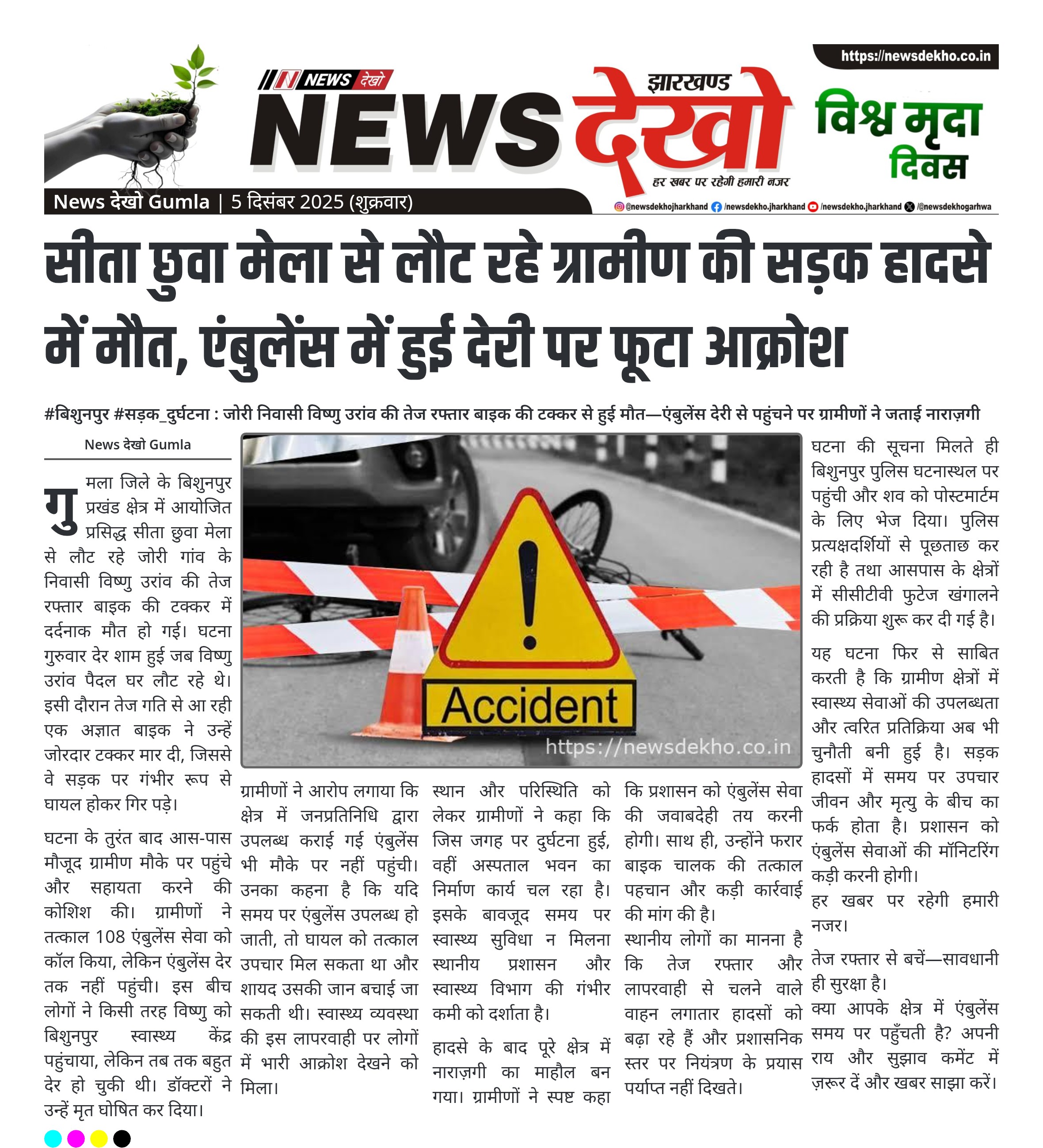 #बिशुनपुर #सड़क_दुर्घटना : जोरी निवासी विष्णु उरांव की तेज रफ्तार बाइक की टक्कर से हुई मौत—एंबुलेंस देरी से पहुंचने पर ग्रामीणों ने जताई नाराज़गी सीता छुवा मेला से लौटते समय विष्णु उरांव (55) को तेज रफ्तार बाइक ने मारी जोरदार टक्कर। JH07C 9240 नंबर की बाइक से हुई दुर्घटना, चालक…