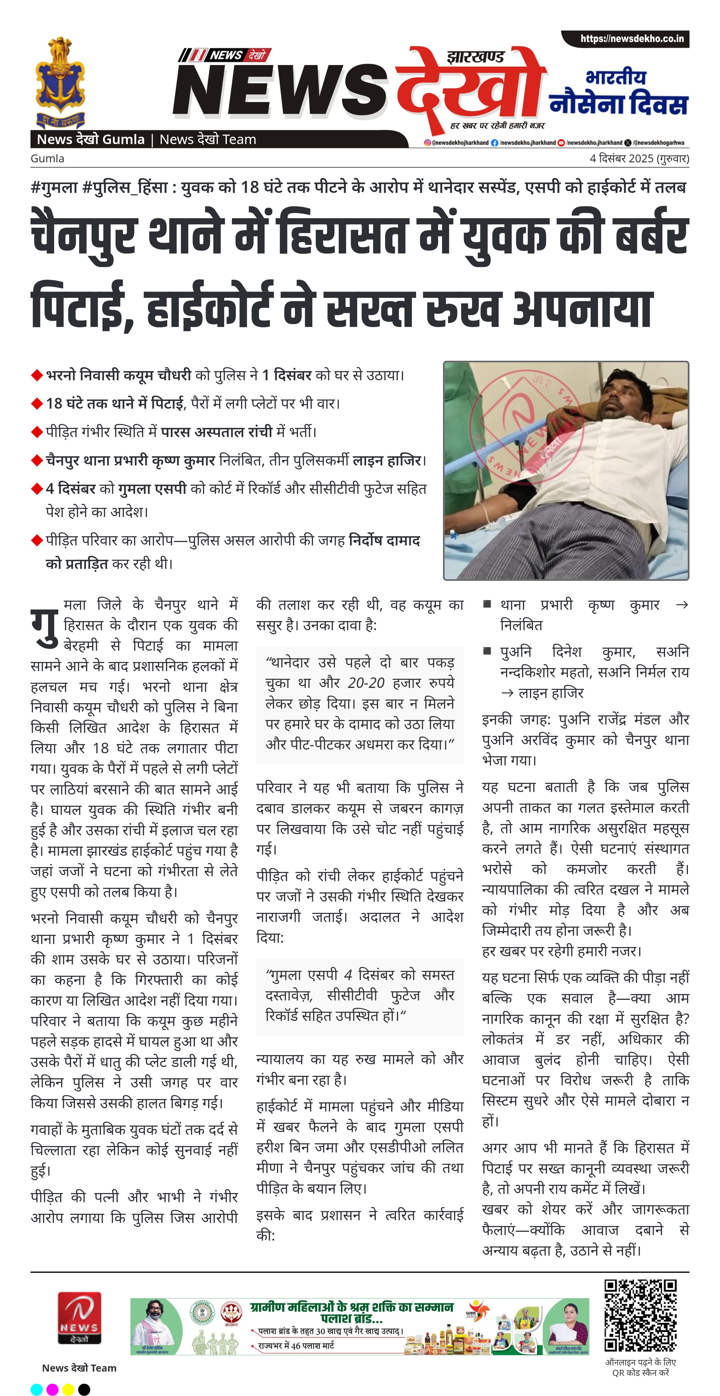 #गुमला #पुलिस_हिंसा : युवक को 18 घंटे तक पीटने के आरोप में थानेदार सस्पेंड, एसपी को हाईकोर्ट में तलब भरनो निवासी कयूम चौधरी को पुलिस ने 1 दिसंबर को घर से उठाया। 18 घंटे तक थाने में पिटाई, पैरों में लगी प्लेटों पर भी वार। पीड़ित गंभीर स्थिति में पारस…