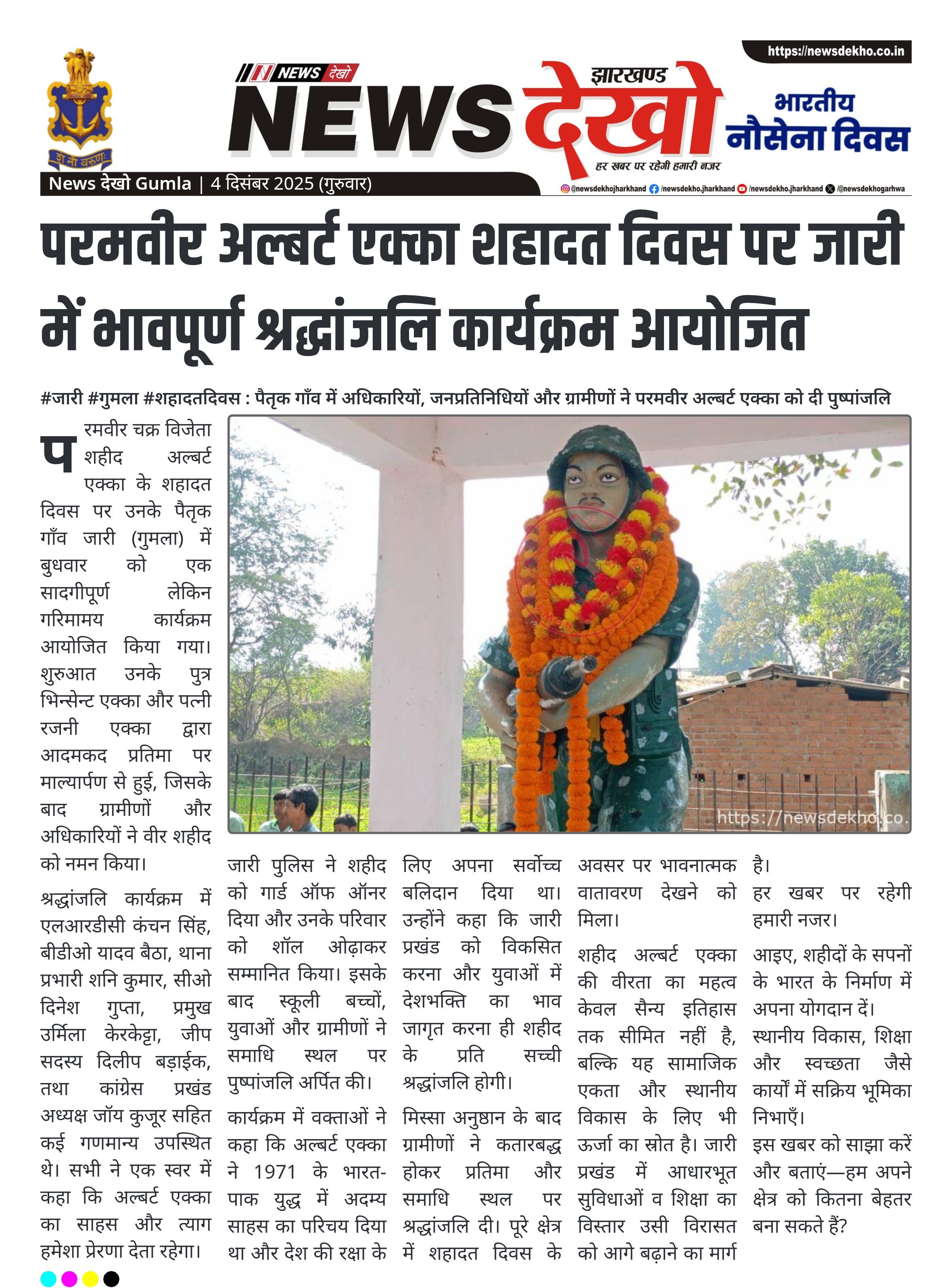 #जारी #श्रद्धांजलि : परमवीर चक्र विजेता अलबर्ट एक्का के शहादत दिवस पर जारी और चैनपुर में प्रशासन व नागरिक करेंगे श्रद्धांजलि अर्पित। अलबर्ट एक्का, पूर्वोत्तर भारत के एकमात्र परमवीर चक्र विजेता। 3 दिसंबर को उनके 54वें शहादत दिवस पर श्रद्धांजलि कार्यक्रम। पैतृक गांव जारी में मुख्य आयोजन, चैनपुर स्मारक पर…