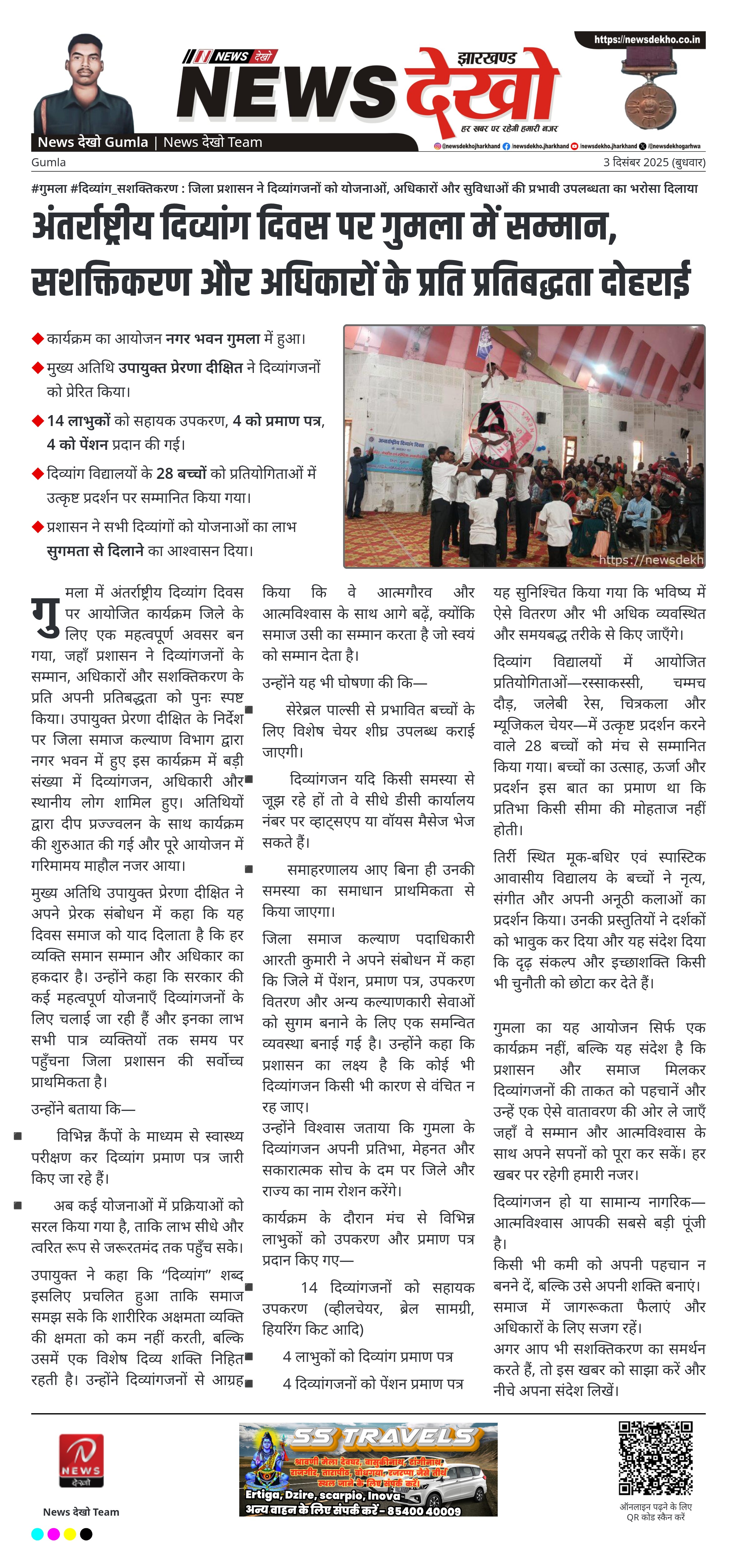 अंतर्राष्ट्रीय दिव्यांग दिवस पर गुमला में सम्मान, सशक्तिकरण और अधिकारों के प्रति प्रतिबद्धता दोहराई