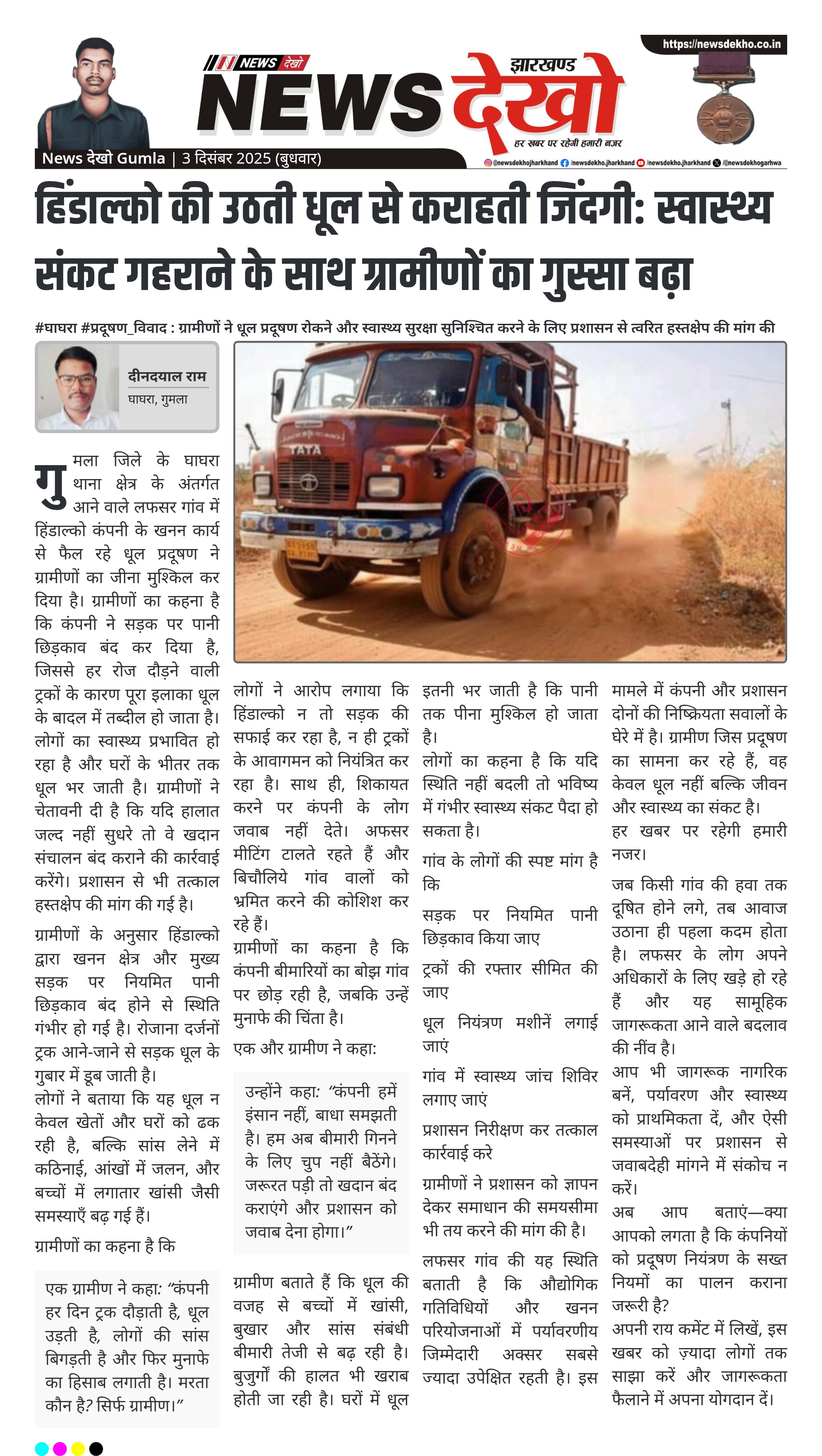 #घाघरा #प्रदूषण_विवाद : ग्रामीणों ने धूल प्रदूषण रोकने और स्वास्थ्य सुरक्षा सुनिश्चित करने के लिए प्रशासन से त्वरित हस्तक्षेप की मांग की घाघरा थाना क्षेत्र के लफसर गांव में हिंडाल्को के खनन कार्य से भारी धूल प्रदूषण फैलने की शिकायत। ग्रामीणों का आरोप कि सड़क पर पानी छिड़काव बंद, ट्रकों…