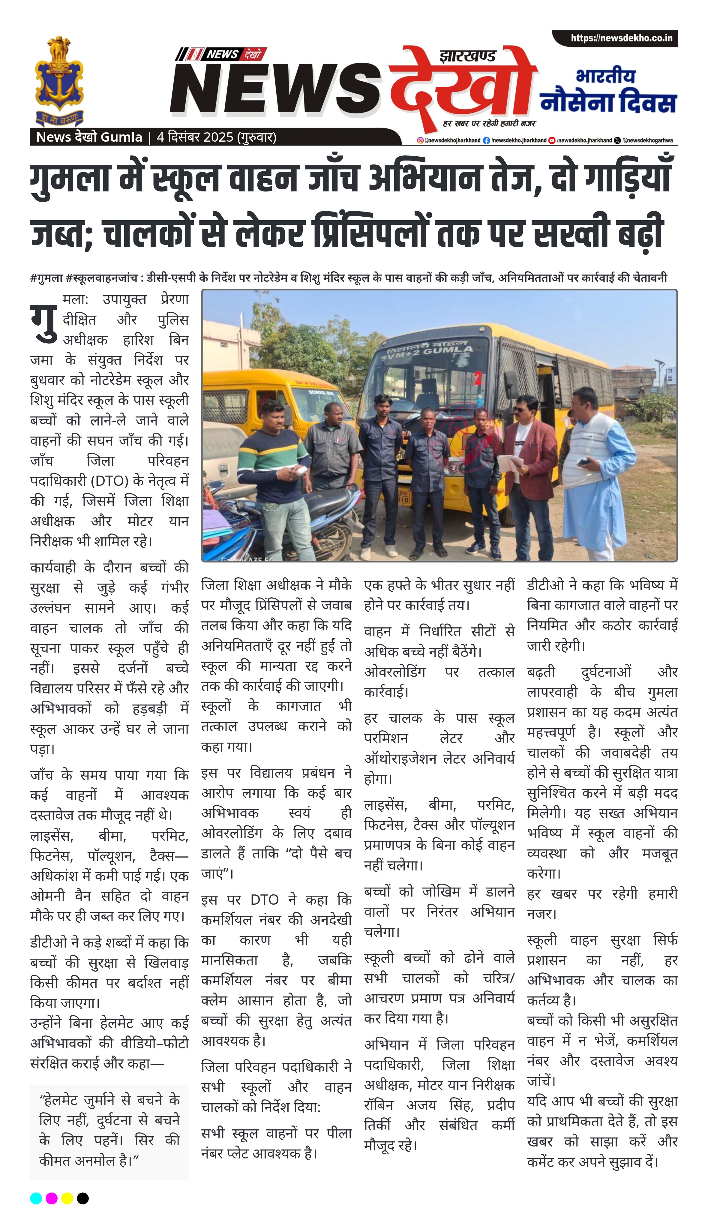 #गुमला #स्कूलवाहनजांच : डीसी-एसपी के निर्देश पर नोटरेडेम व शिशु मंदिर स्कूल के पास वाहनों की कड़ी जाँच, अनियमितताओं पर कार्रवाई की चेतावनी स्कूली वाहन जाँच में दो गाड़ियाँ जब्त, एक ओमनी वैन शामिल। कई वाहन चालकों के पास लाइसेंस, परमिट, बीमा, फिटनेस, टैक्स, पॉल्यूशन तक नहीं मिले। अभिभावक–प्रिंसिपल पर…