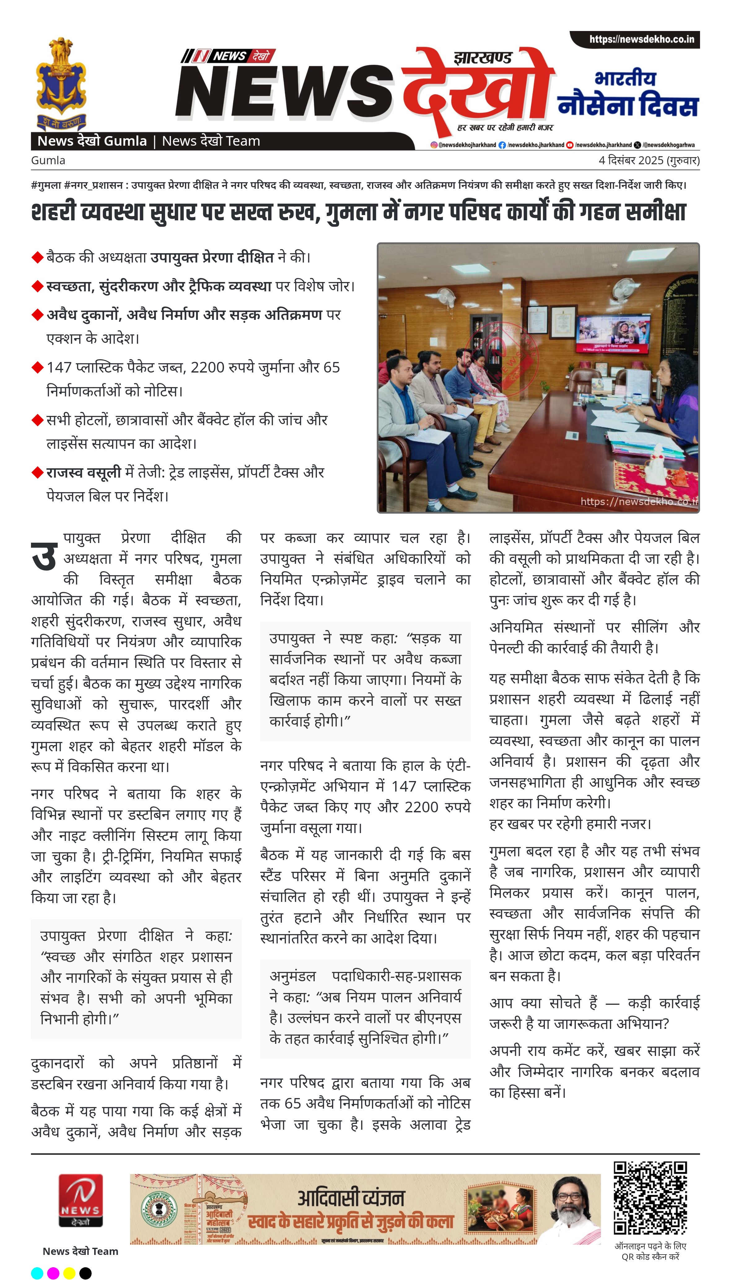 #गुमला #नगर_प्रशासन : उपायुक्त प्रेरणा दीक्षित ने नगर परिषद की व्यवस्था, स्वच्छता, राजस्व और अतिक्रमण नियंत्रण की समीक्षा करते हुए सख्त दिशा-निर्देश जारी किए। बैठक की अध्यक्षता उपायुक्त प्रेरणा दीक्षित ने की। स्वच्छता, सुंदरीकरण और ट्रैफिक व्यवस्था पर विशेष जोर। अवैध दुकानों, अवैध निर्माण और सड़क अतिक्रमण पर एक्शन के…