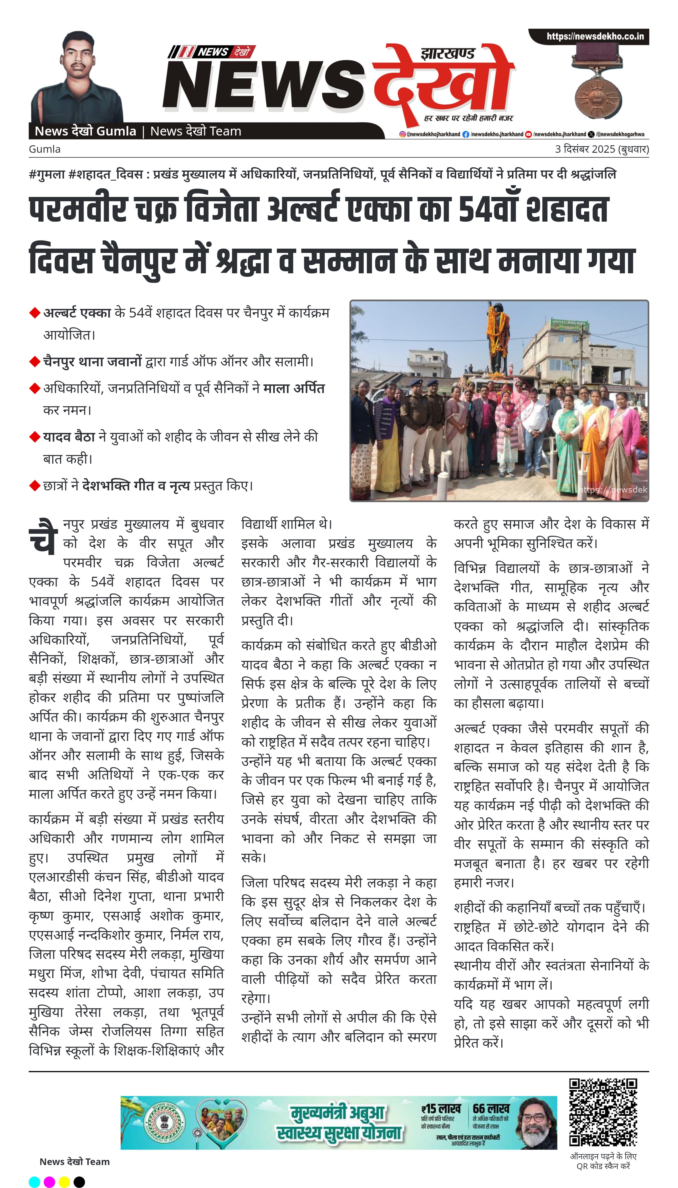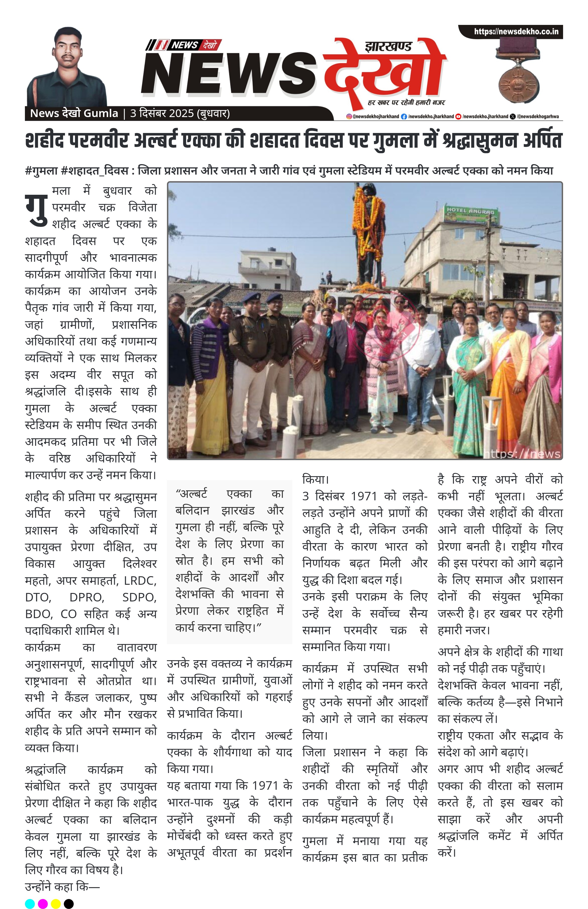 परमवीर अल्बर्ट एक्का शहादत दिवस पर जारी में भावपूर्ण श्रद्धांजलि कार्यक्रम आयोजित