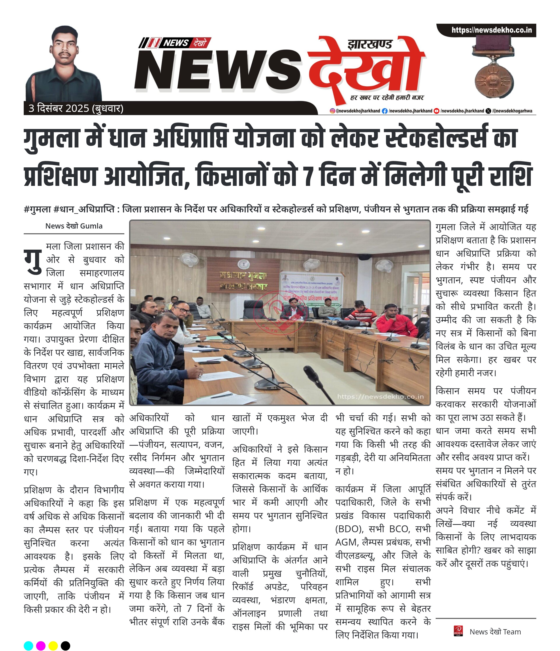 गुमला में धान अधिप्राप्ति योजना को लेकर स्टेकहोल्डर्स का प्रशिक्षण आयोजित, किसानों को 7 दिन में मिलेगी पूरी राशि