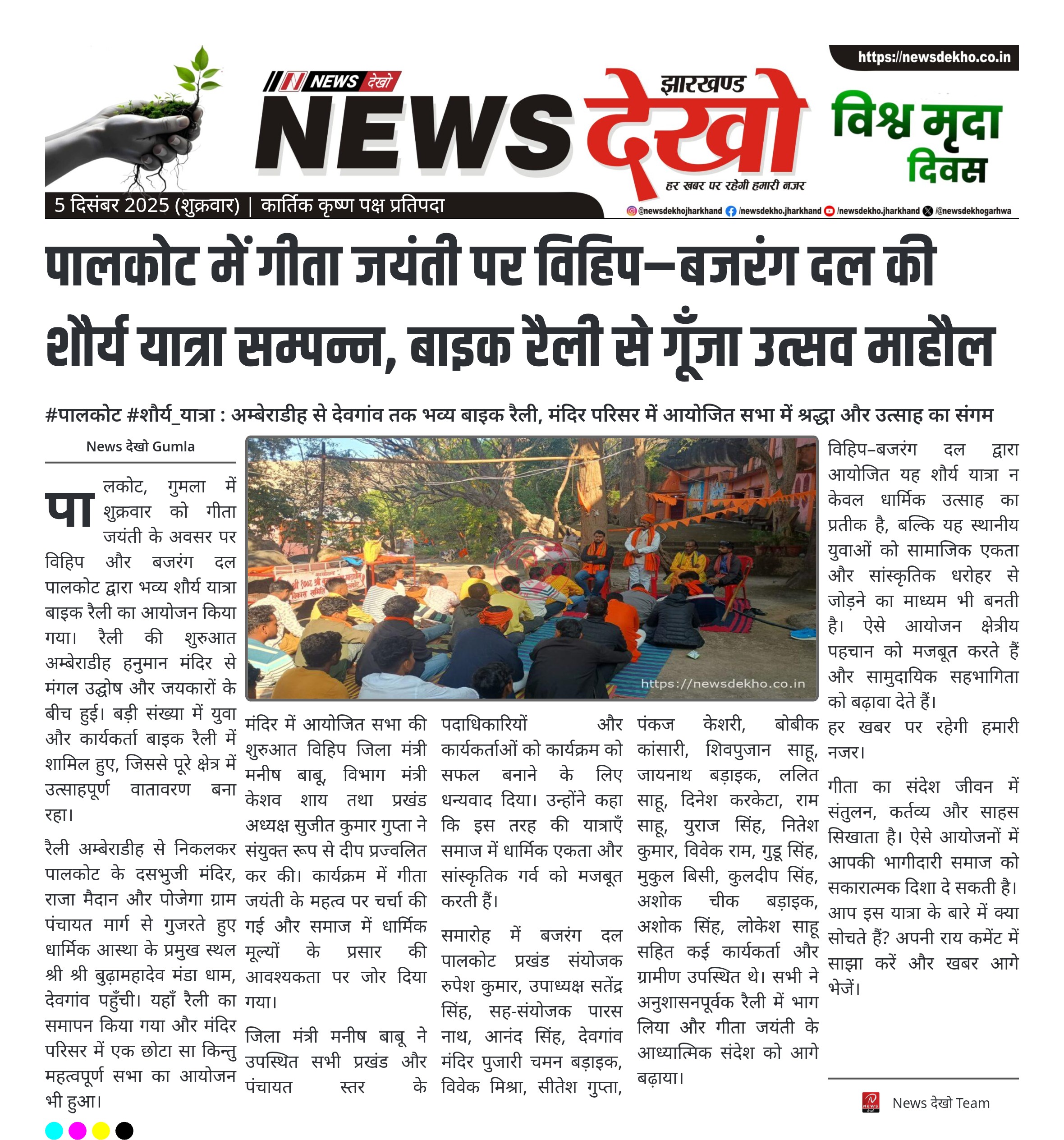 पालकोट में गीता जयंती पर विहिप–बजरंग दल की शौर्य यात्रा सम्पन्न, बाइक रैली से गूँजा उत्सव माहौल