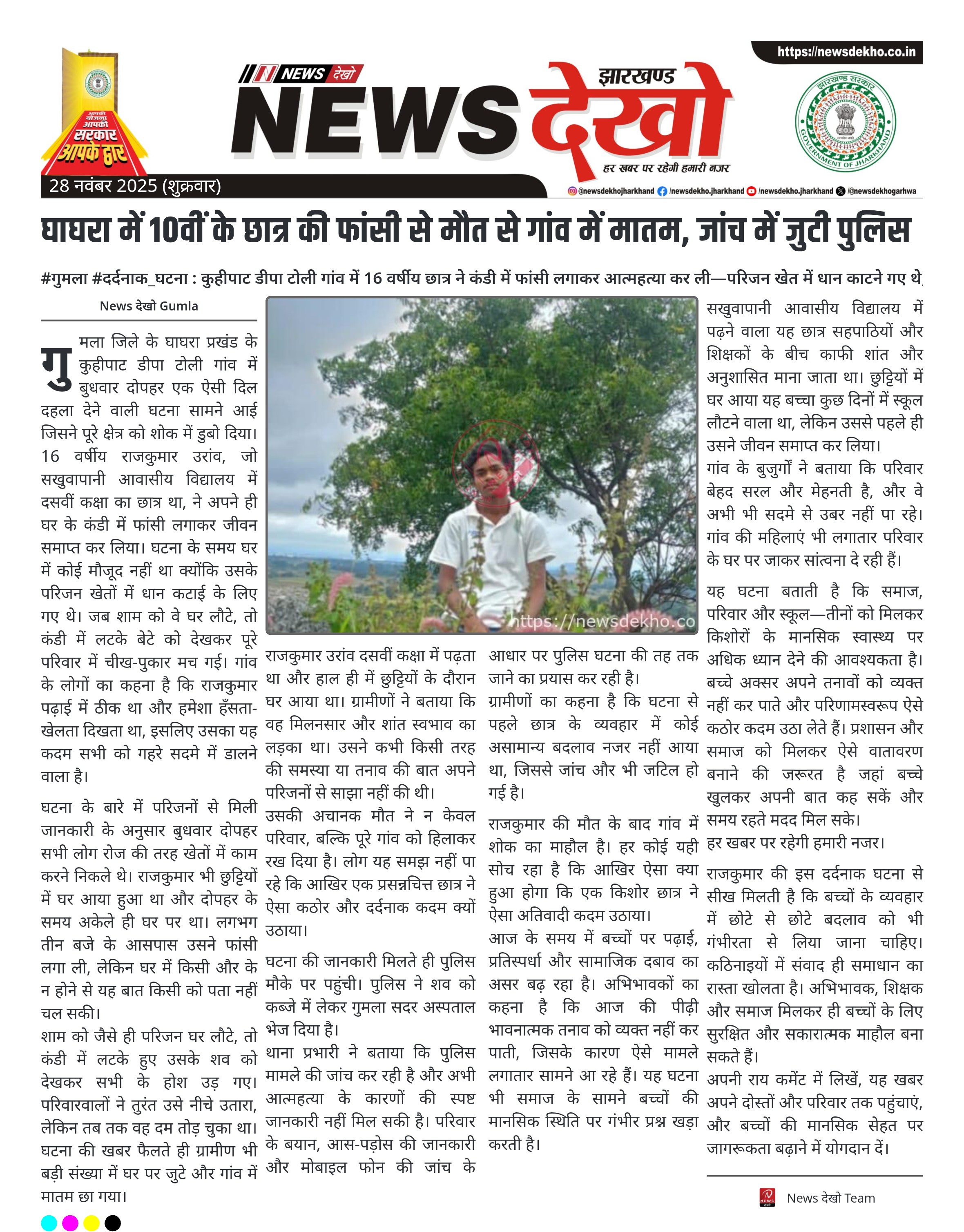 #गुमला #दर्दनाक_घटना : कुहीपाट डीपा टोली गांव में 16 वर्षीय छात्र ने कंडी में फांसी लगाकर आत्महत्या कर ली—परिजन खेत में धान काटने गए थे, शाम को शव मिला। कुहीपाट डीपा टोली, घाघरा में 16 वर्षीय राजकुमार उरांव ने की आत्महत्या। घटना बुधवार दोपहर करीब 3 बजे घर में अकेले…
