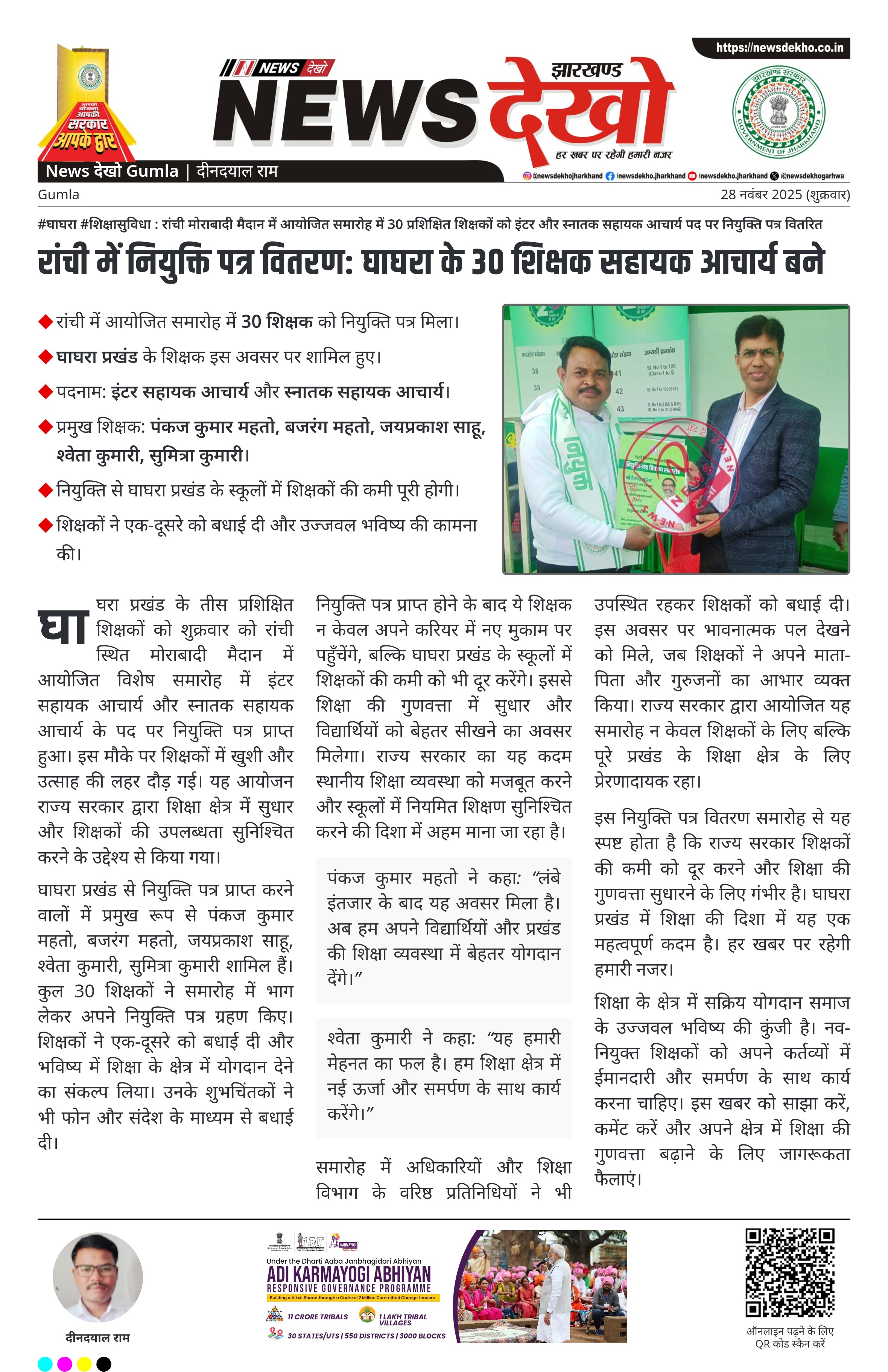 रांची में नियुक्ति पत्र वितरण: घाघरा के 30 शिक्षक सहायक आचार्य बने