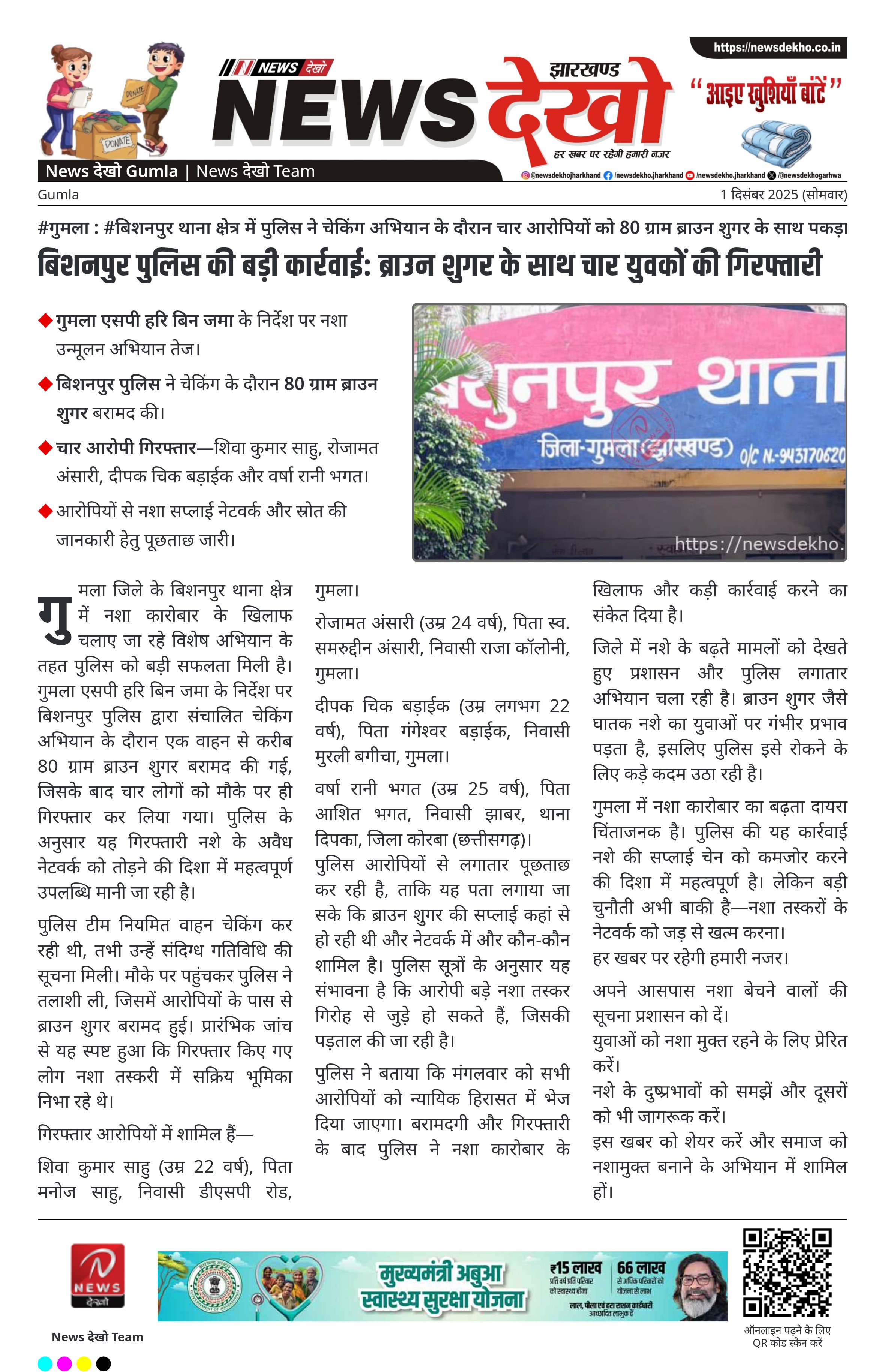 #गुमला : #बिशनपुर थाना क्षेत्र में पुलिस ने चेकिंग अभियान के दौरान चार आरोपियों को 80 ग्राम ब्राउन शुगर के साथ पकड़ा—पूछताछ जारी। गुमला एसपी हरि बिन जमा के निर्देश पर नशा उन्मूलन अभियान तेज। बिशनपुर पुलिस ने चेकिंग के दौरान 80 ग्राम ब्राउन शुगर बरामद की। चार आरोपी गिरफ्तार—शिवा…