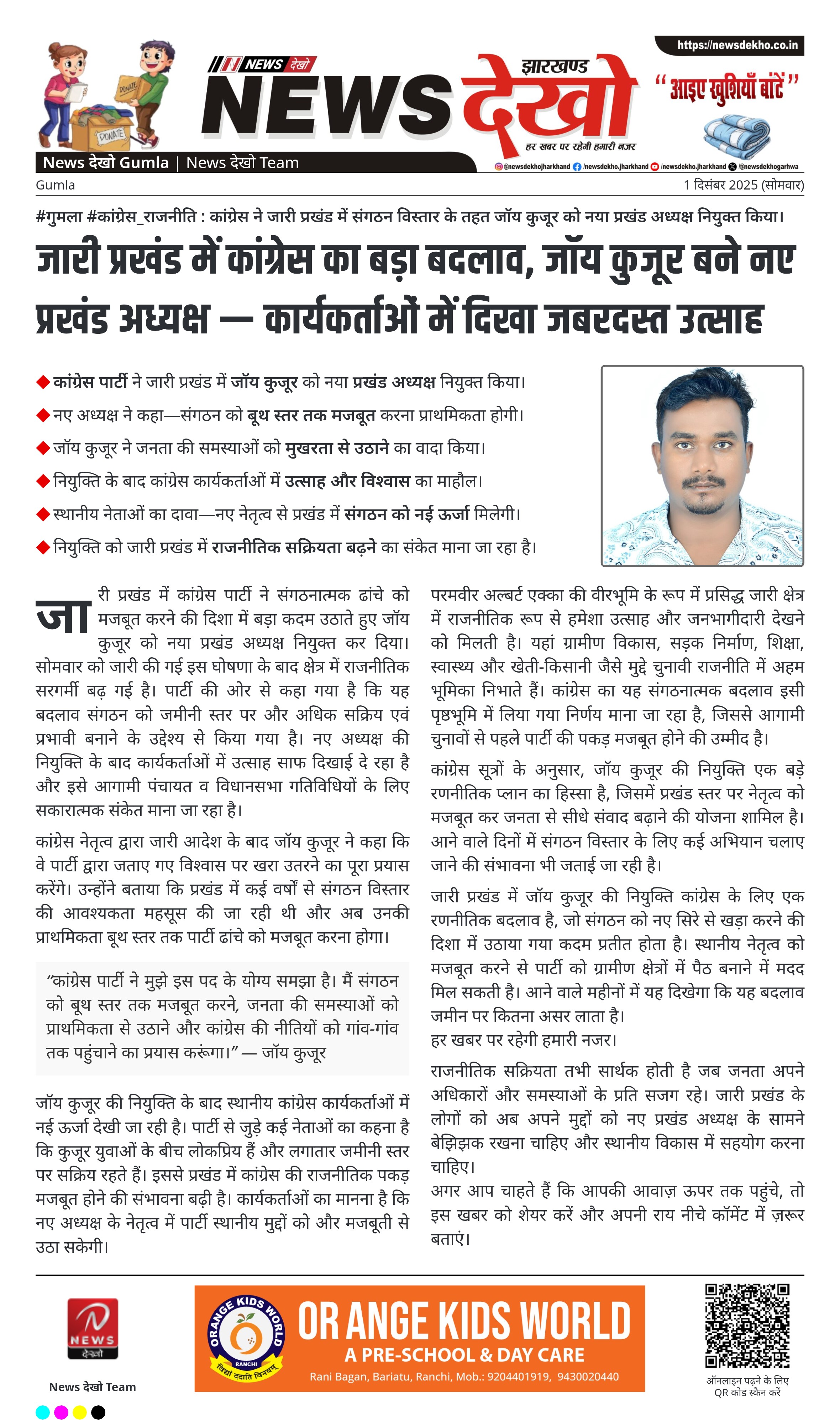 #गुमला #कांग्रेस_राजनीति : कांग्रेस ने जारी प्रखंड में संगठन विस्तार के तहत जॉय कुजूर को नया प्रखंड अध्यक्ष नियुक्त किया। कांग्रेस पार्टी ने जारी प्रखंड में जॉय कुजूर को नया प्रखंड अध्यक्ष नियुक्त किया। नए अध्यक्ष ने कहा—संगठन को बूथ स्तर तक मजबूत करना प्राथमिकता होगी। जॉय कुजूर ने जनता…