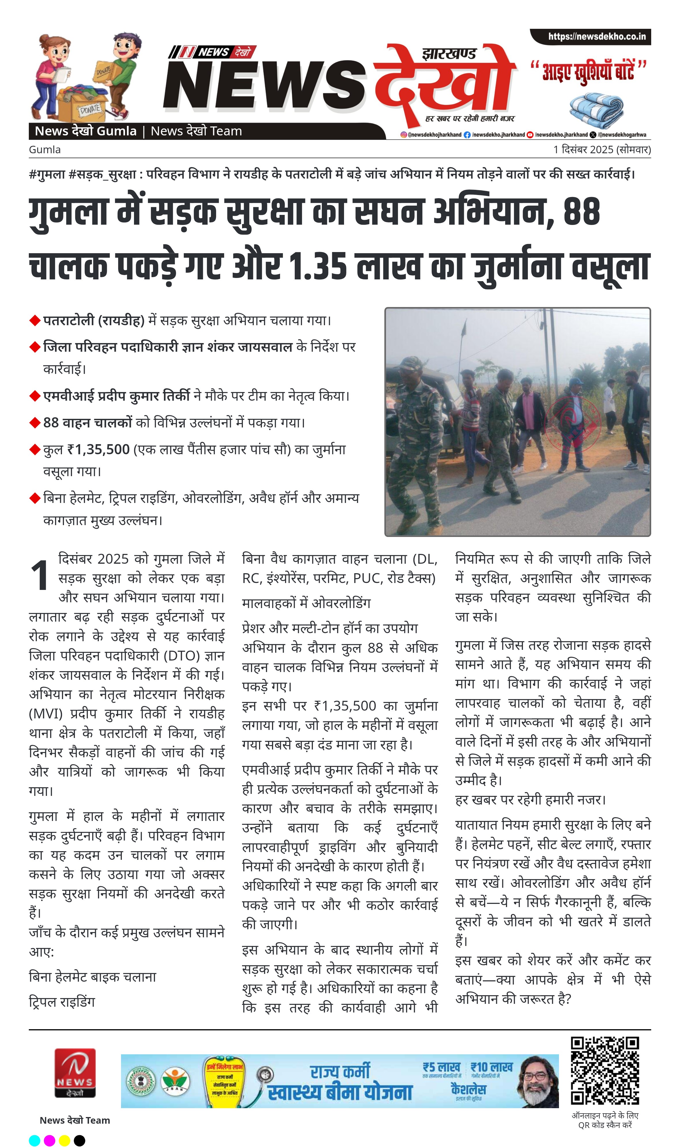 गुमला में सड़क सुरक्षा का सघन अभियान, 88 चालक पकड़े गए और 1.35 लाख का जुर्माना वसूला