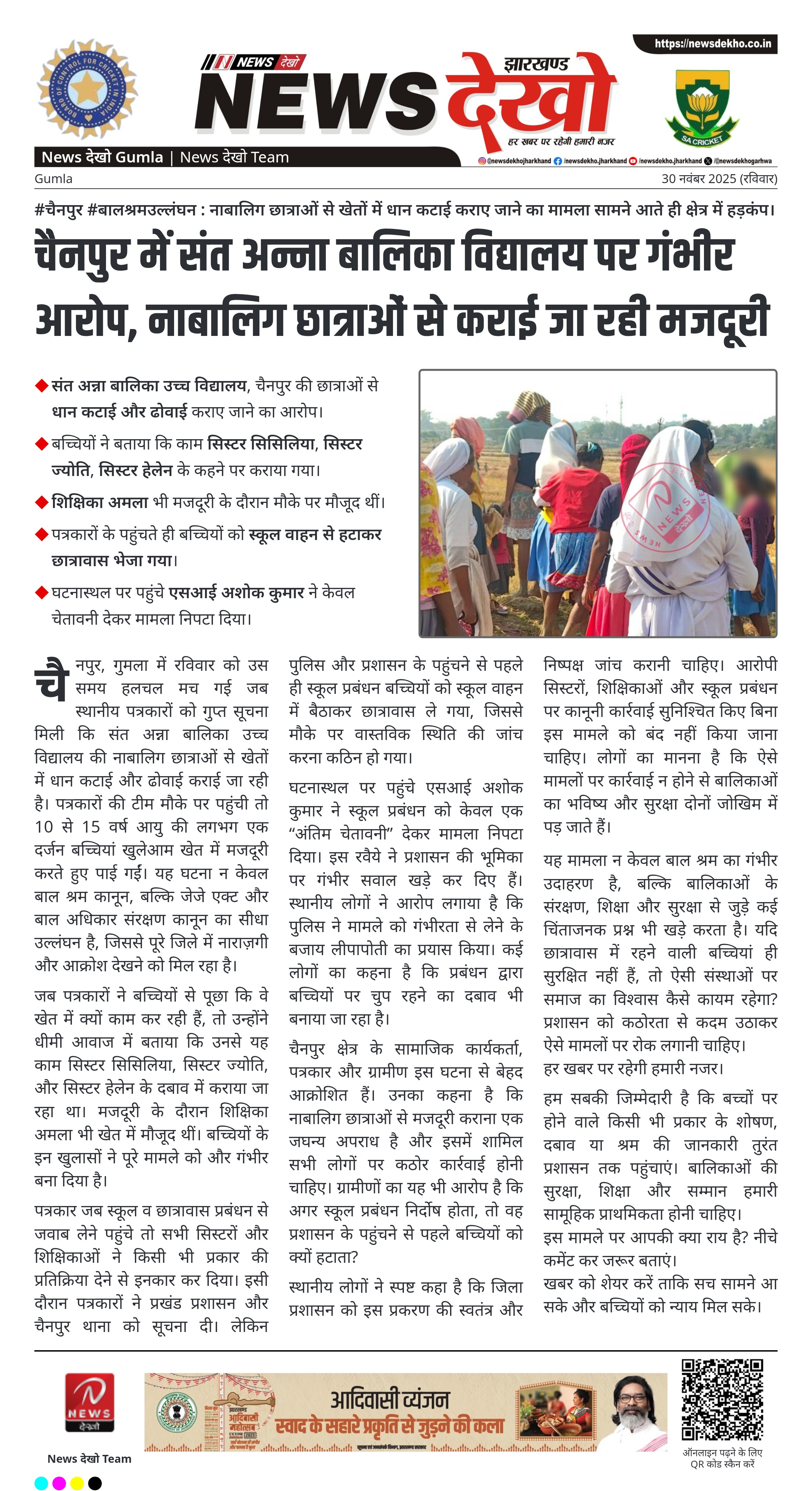 चैनपुर में संत अन्ना बालिका विद्यालय पर गंभीर आरोप, नाबालिग छात्राओं से कराई जा रही मजदूरी