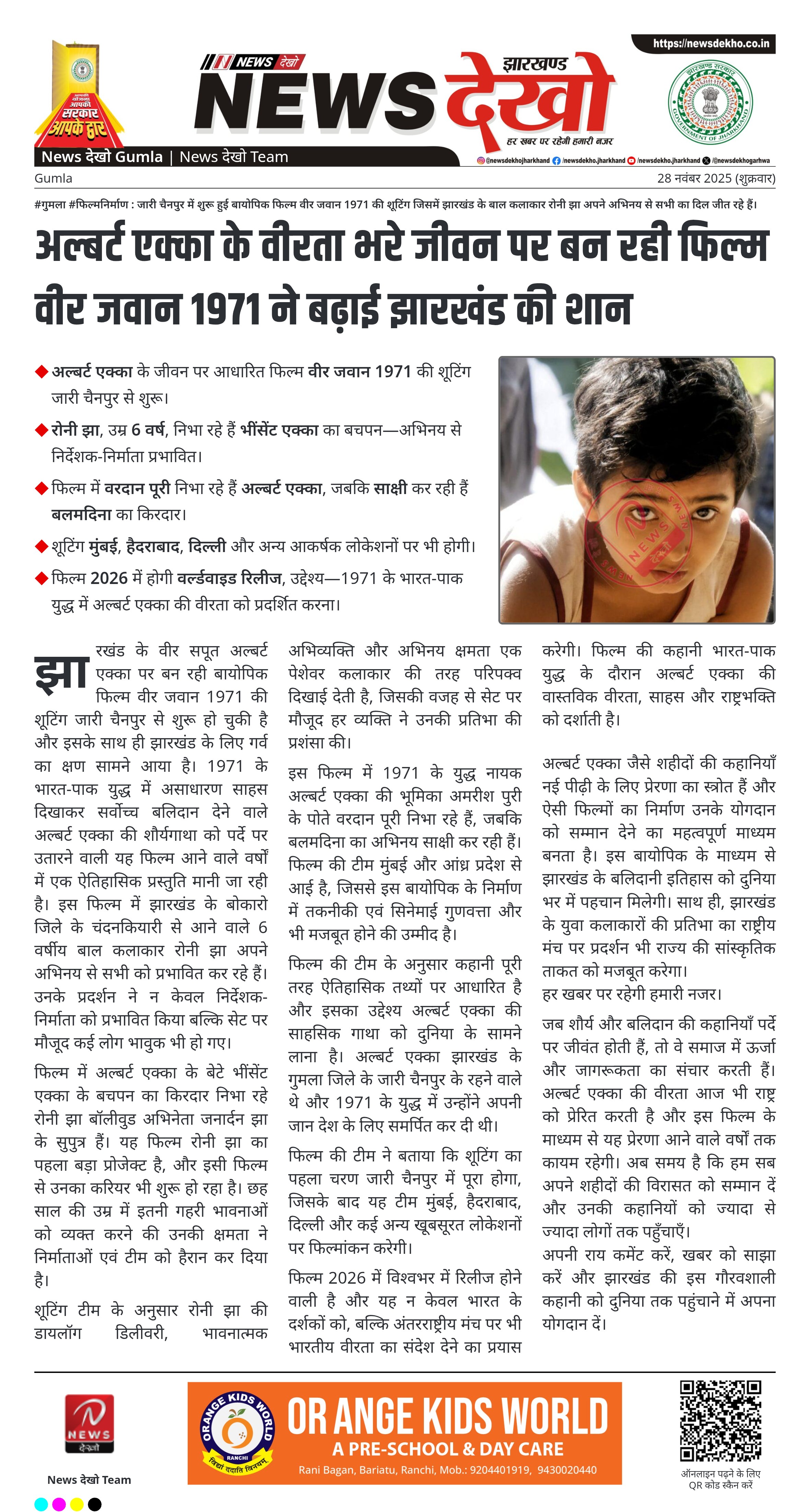 #गुमला #फिल्मनिर्माण : जारी चैनपुर में शुरू हुई बायोपिक फिल्म वीर जवान 1971 की शूटिंग जिसमें झारखंड के बाल कलाकार रोनी झा अपने अभिनय से सभी का दिल जीत रहे हैं। अल्बर्ट एक्का के जीवन पर आधारित फिल्म वीर जवान 1971 की शूटिंग जारी चैनपुर से शुरू। रोनी झा, उम्र…