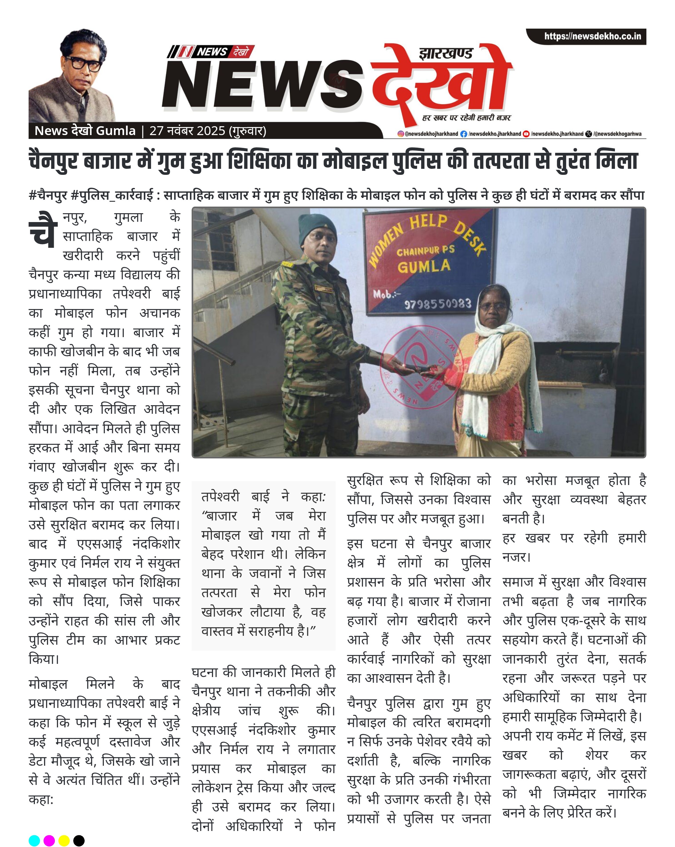 चैनपुर बाजार में गुम हुआ शिक्षिका का मोबाइल पुलिस की तत्परता से तुरंत मिला