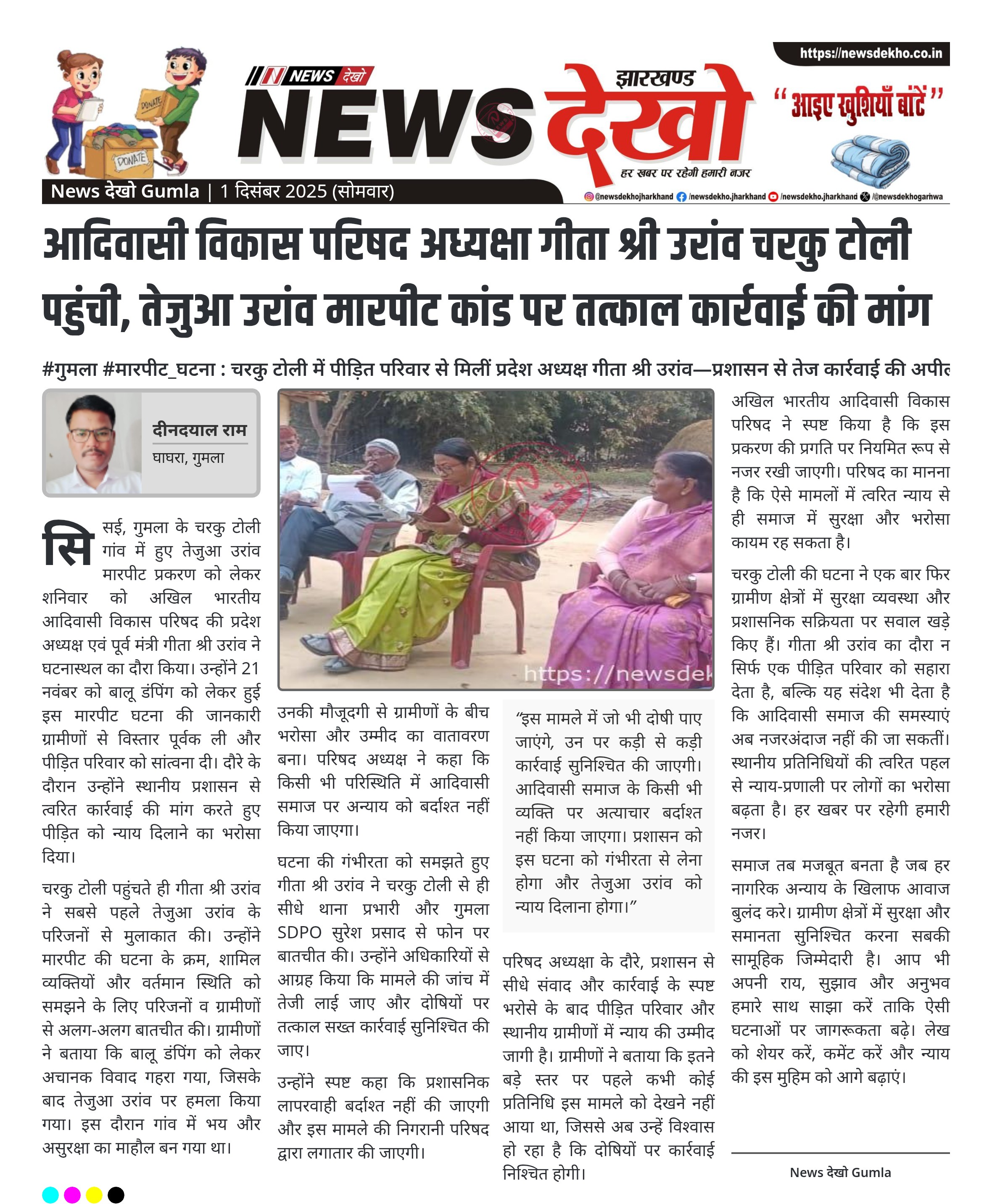 आदिवासी विकास परिषद अध्यक्षा गीता श्री उरांव चरकु टोली पहुंची, तेजुआ उरांव मारपीट कांड पर तत्काल कार्रवाई की मांग