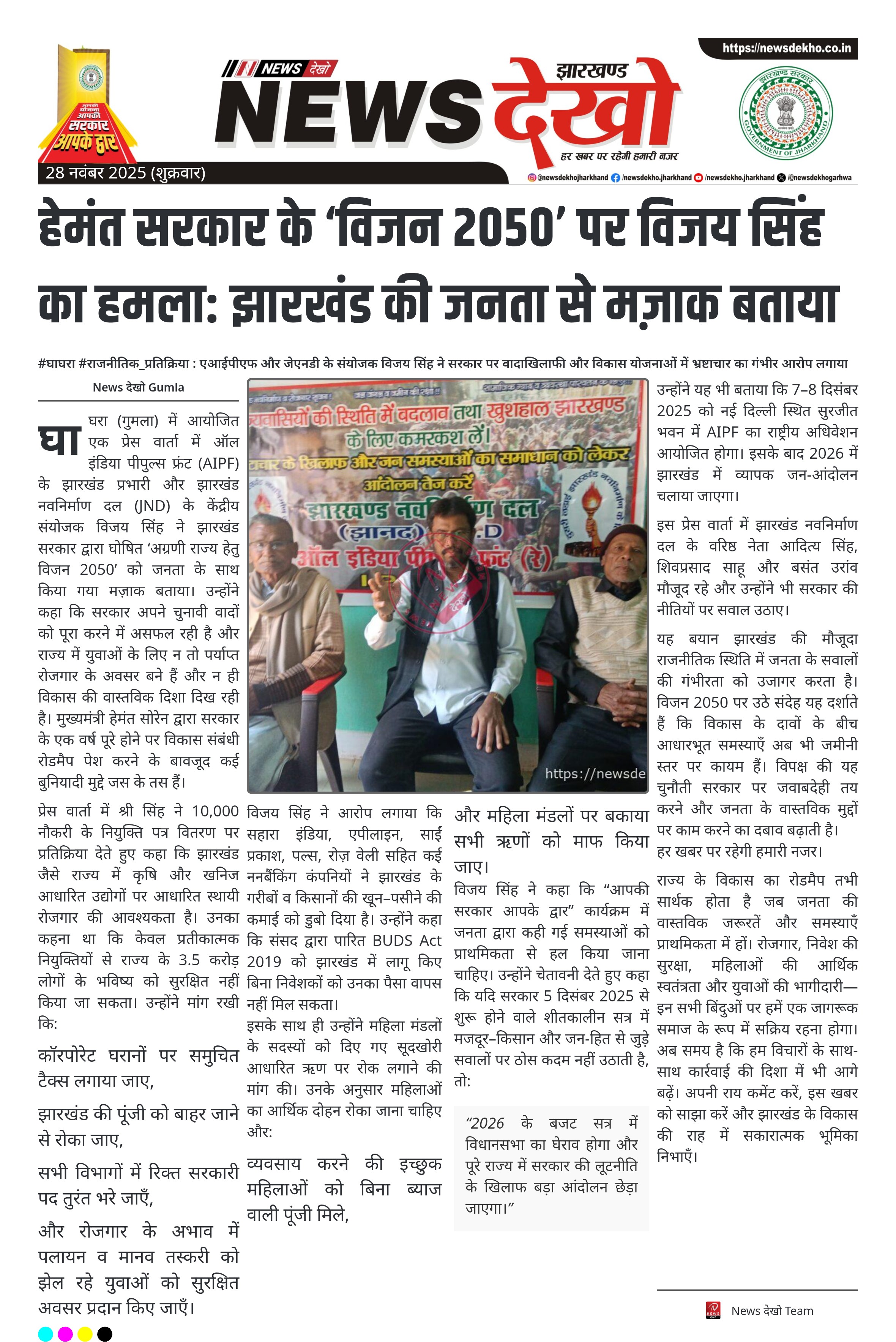 #घाघरा #राजनीतिक_प्रतिक्रिया : एआईपीएफ और जेएनडी के संयोजक विजय सिंह ने सरकार पर वादाखिलाफी और विकास योजनाओं में भ्रष्टाचार का गंभीर आरोप लगाया विजय सिंह, झारखंड प्रभारी एआईपीएफ व केंद्रीय संयोजक जेएनडी ने विजन 2050 को जनता से मज़ाक बताया। 10,000 नियुक्ति पत्र वितरण पर प्रतिक्रिया देते हुए कृषि–खनन आधारित…