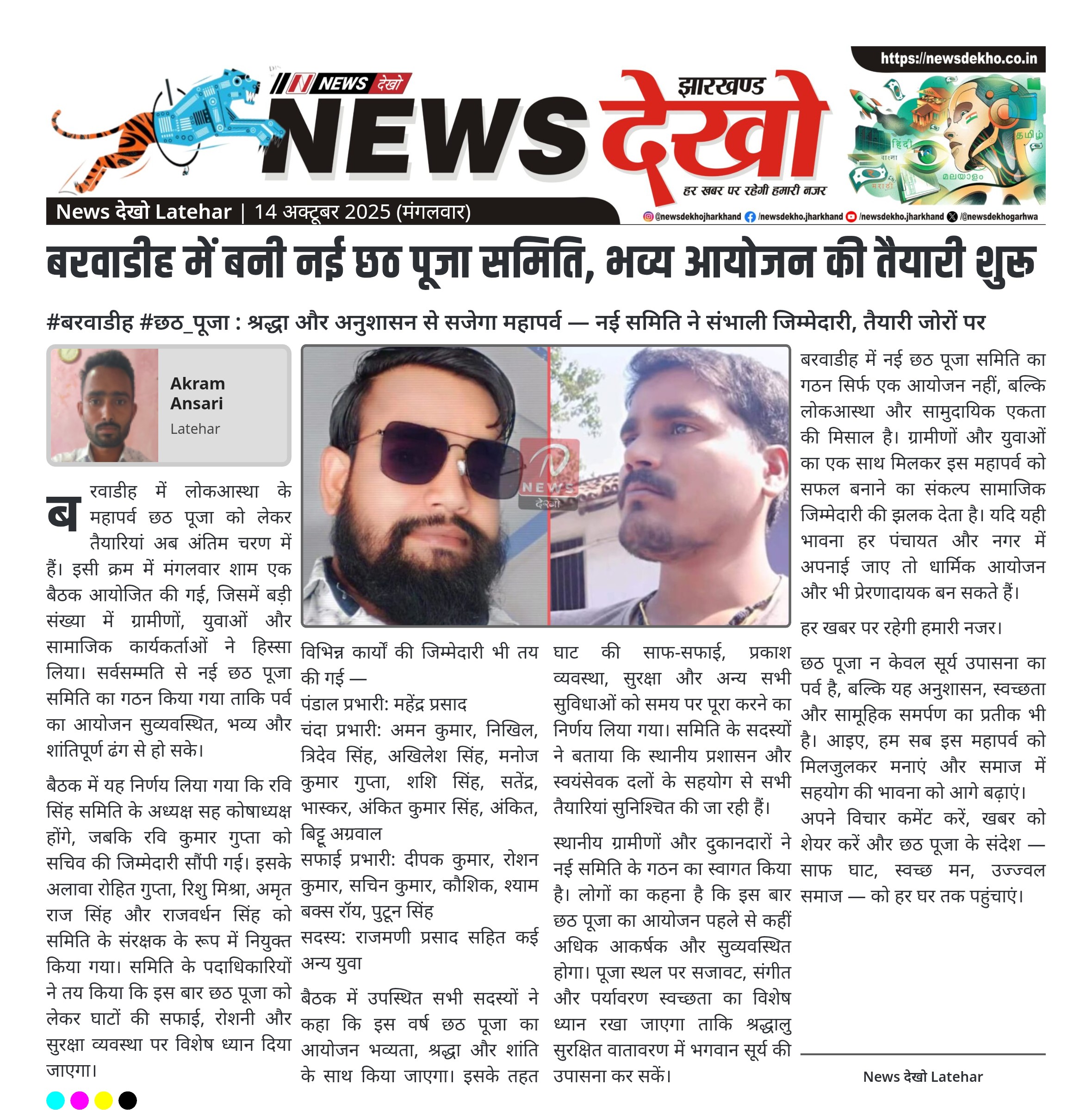 #चंदवा #छठपूजा : जय हिन्द पुस्तकालय सभागार में हुई बैठक, सर्वसम्मति से बनी नई समिति, लकी ड्रॉ योजना हुई समाप्त विवेकानंद छठ पूजा समिति की नई कमेटी का सर्वसम्मति से गठन किया गया। अध्यक्ष बने रमेश प्रसाद, जबकि कई नए पदाधिकारियों को जिम्मेदारी सौंपी गई। इस वर्ष उपहार योजना (लकी…