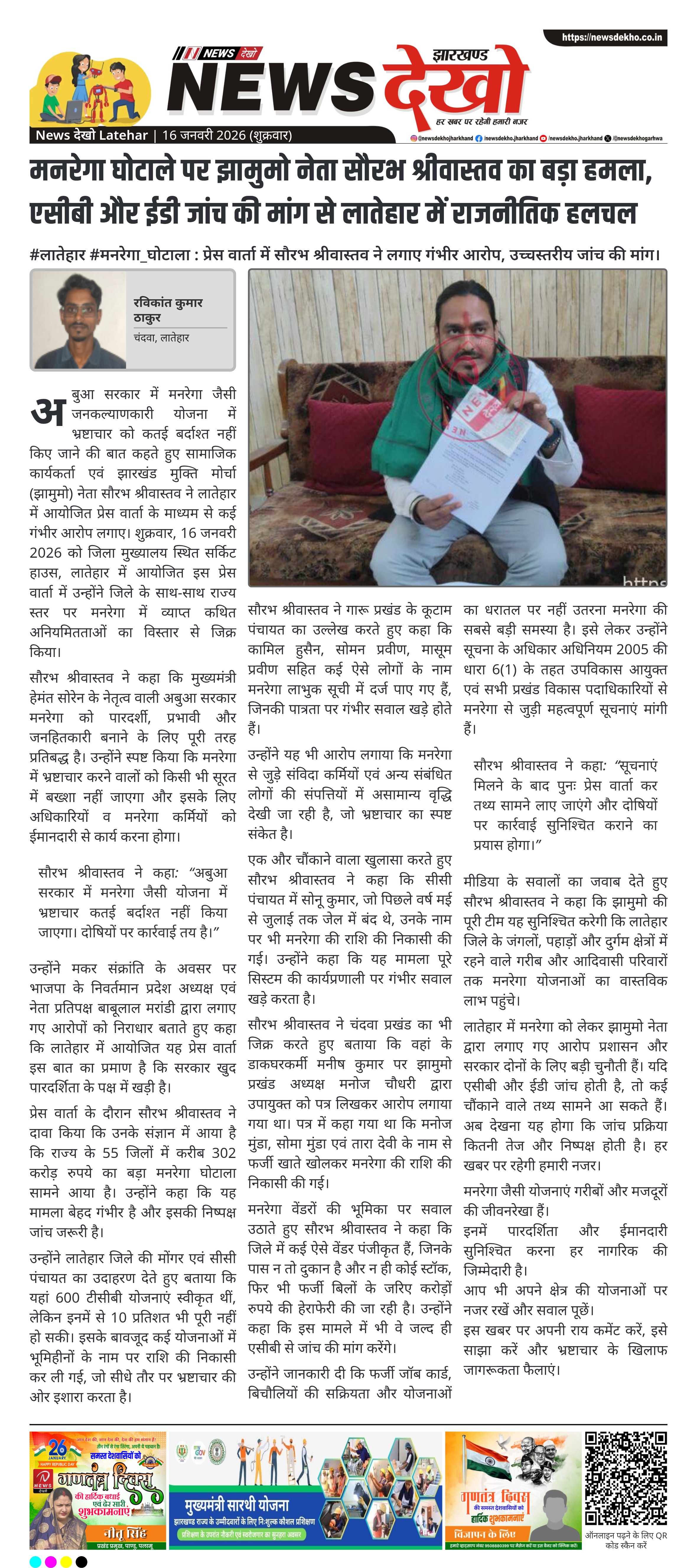 मनरेगा घोटाले पर झामुमो नेता सौरभ श्रीवास्तव का बड़ा हमला, एसीबी और ईडी जांच की मांग से लातेहार में राजनीतिक हलचल