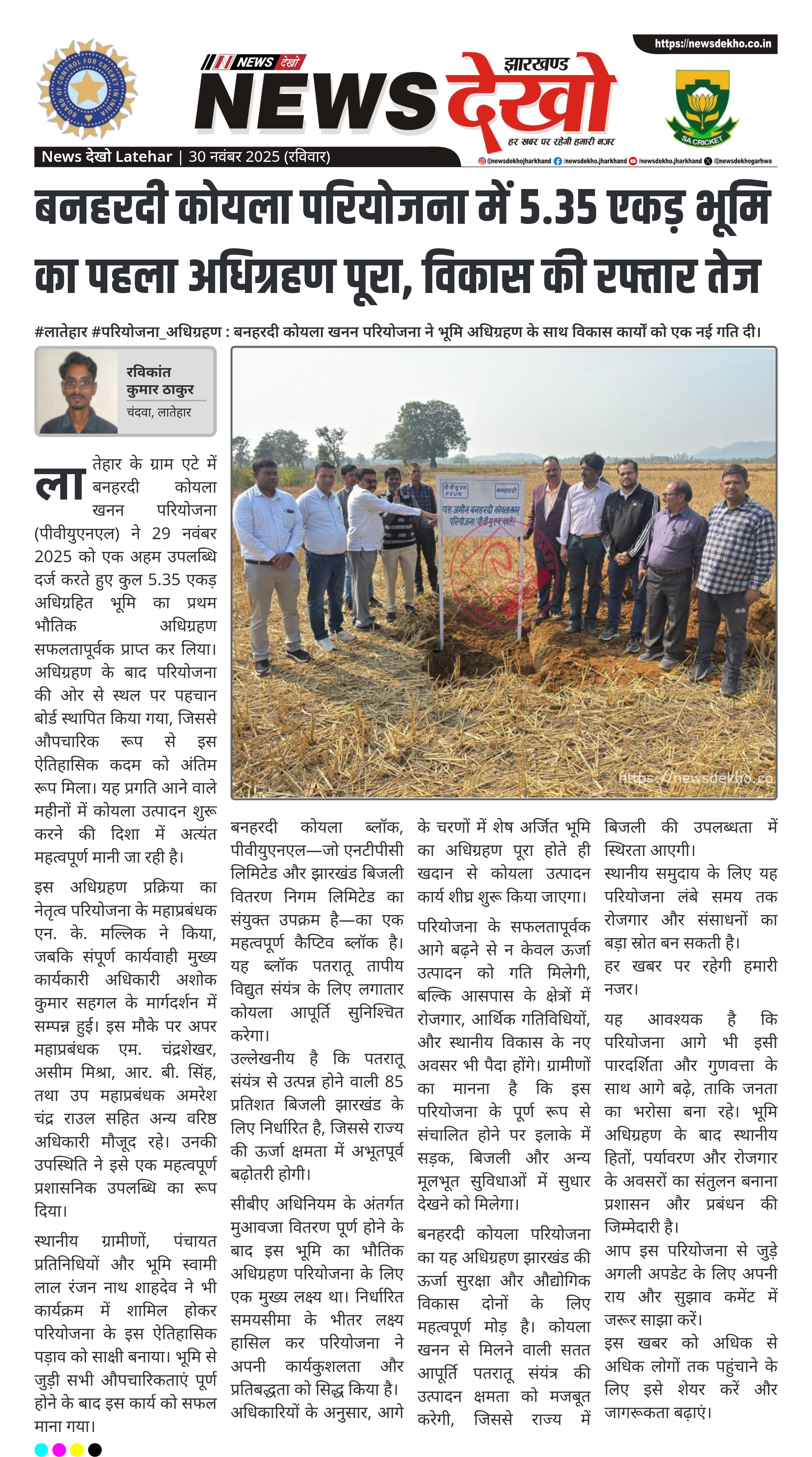 लातेहार में खदान संचालन की दिशा में बड़ा कदम: बनहरदी कोयला खनन परियोजना ने 5.35 एकड़ भूमि का प्रथम भौतिक कब्जा लिया
