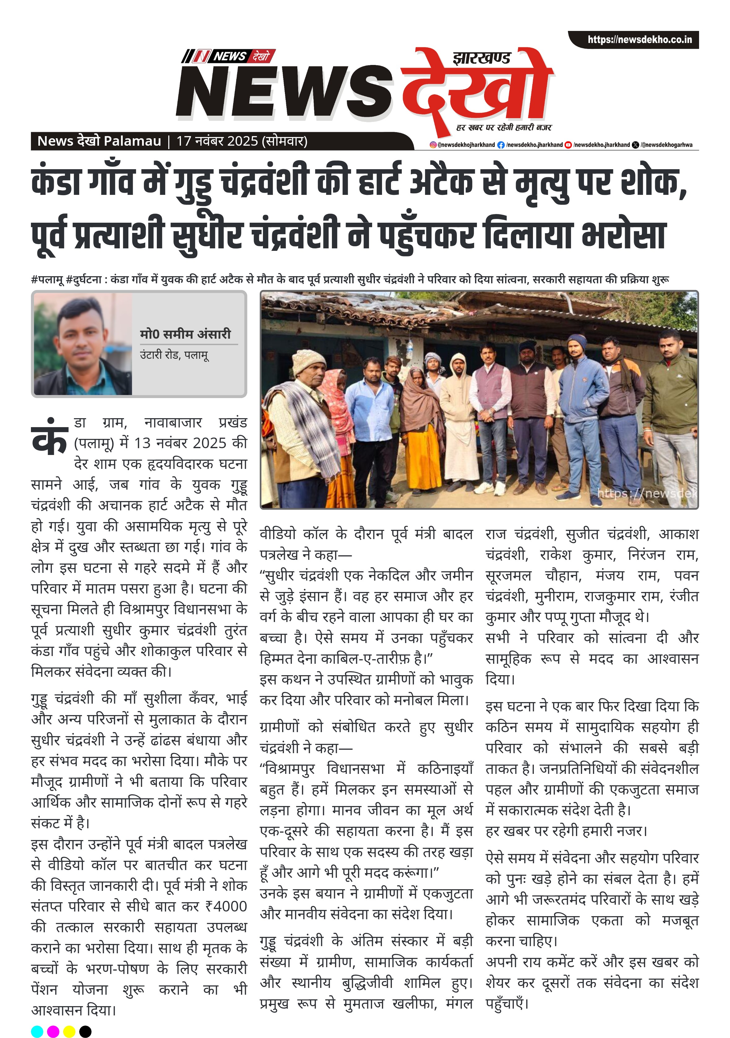 #पलामू #दुर्घटना : कंडा गाँव में युवक की हार्ट अटैक से मौत के बाद पूर्व प्रत्याशी सुधीर चंद्रवंशी ने परिवार को दिया सांत्वना, सरकारी सहायता की प्रक्रिया शुरू कंडा गाँव में गुड्डू चंद्रवंशी का अचानक हार्ट अटैक से निधन, पूरे क्षेत्र में शोक। पूर्व प्रत्याशी सुधीर चंद्रवंशी पहुँचे मौके पर,…