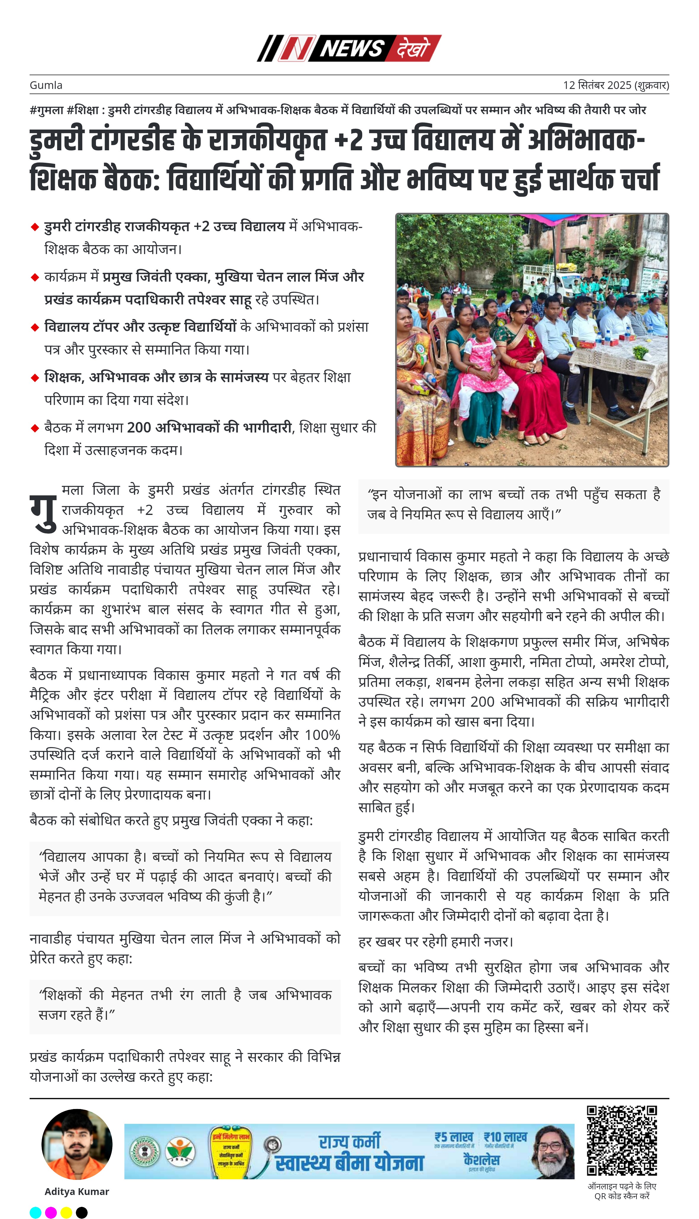 #गुमला #शिक्षा : डुमरी टांगरडीह विद्यालय में अभिभावक-शिक्षक बैठक में विद्यार्थियों की उपलब्धियों पर सम्मान और भविष्य की तैयारी पर जोर डुमरी टांगरडीह राजकीयकृत +2 उच्च विद्यालय में अभिभावक-शिक्षक बैठक का आयोजन। कार्यक्रम में प्रमुख जिवंती एक्का, मुखिया चेतन लाल मिंज और प्रखंड कार्यक्रम पदाधिकारी तपेश्वर साहू रहे उपस्थित। विद्यालय…