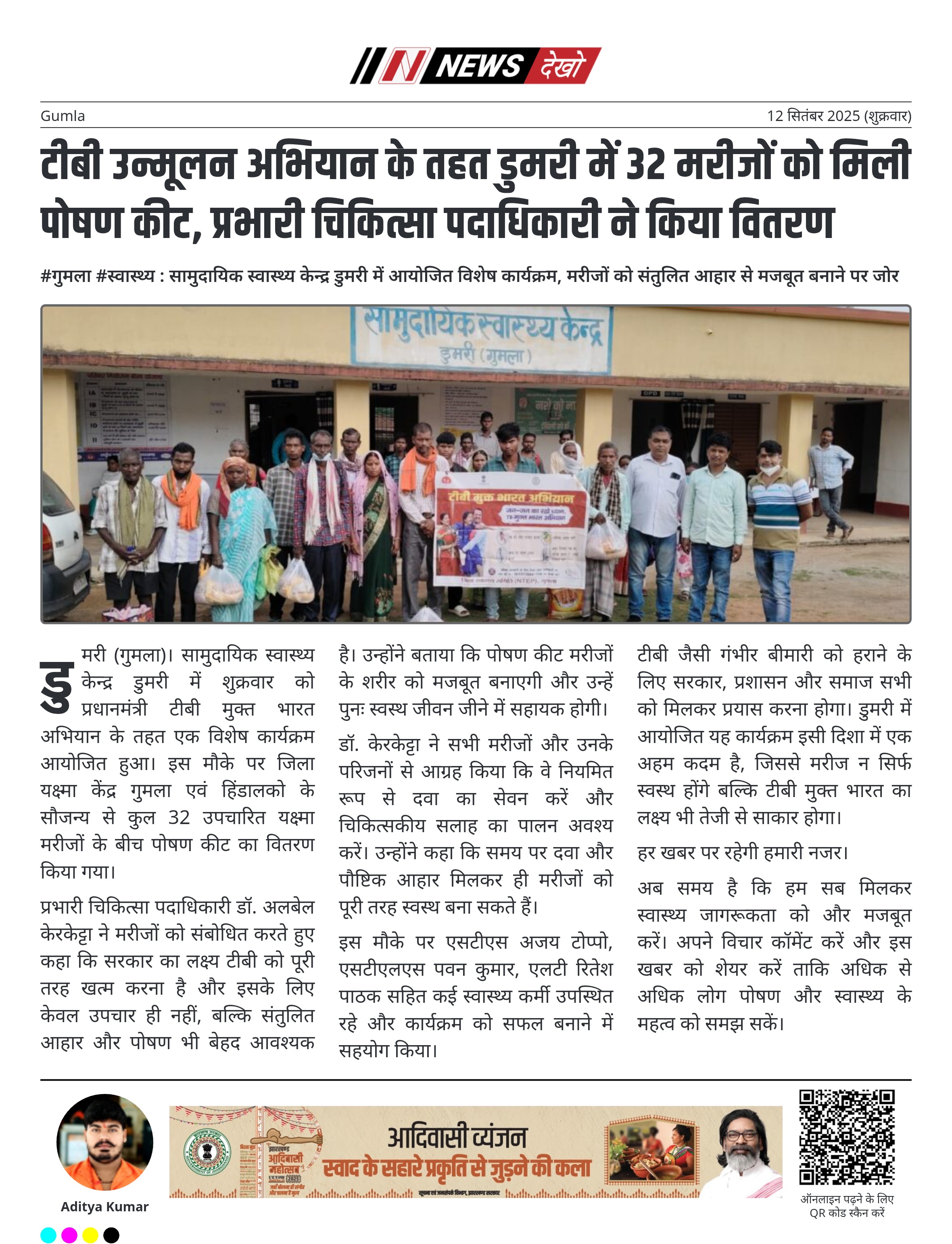 #गुमला #स्वास्थ्य : सामुदायिक स्वास्थ्य केन्द्र डुमरी में आयोजित विशेष कार्यक्रम, मरीजों को संतुलित आहार से मजबूत बनाने पर जोर प्रधानमंत्री टीबी मुक्त भारत अभियान के तहत डुमरी में पोषण कीट वितरण। कुल 32 यक्ष्मा मरीजों को मिला संतुलित आहार से भरपूर किट। डॉ. अलबेल केरकेट्टा ने कहा—टीबी उन्मूलन सरकार…