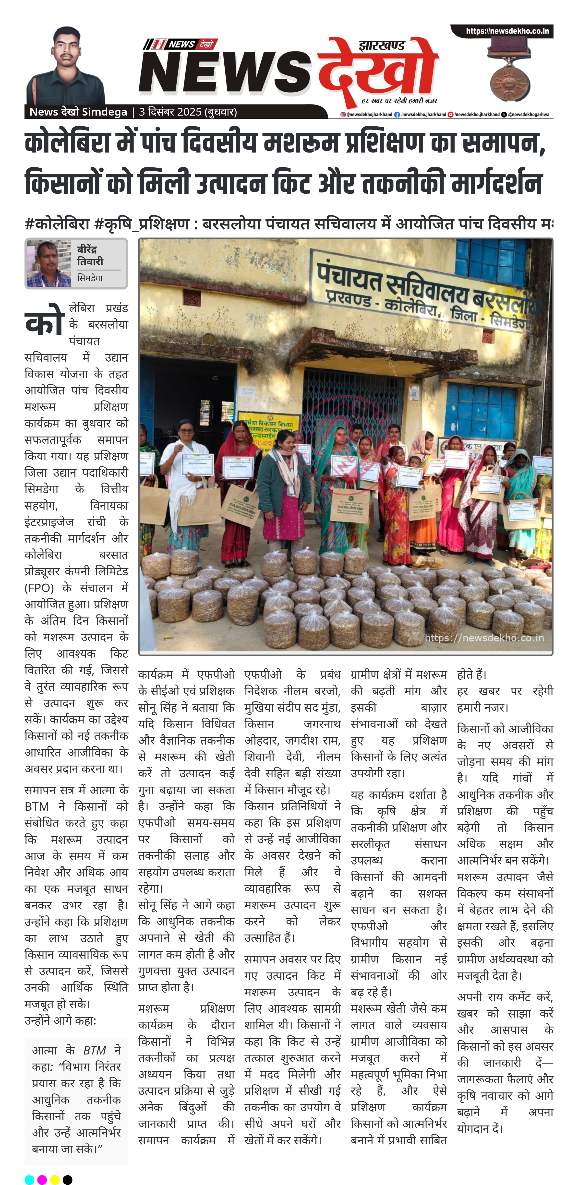 #कोलेबिरा #कृषि_प्रशिक्षण : बरसलोया पंचायत सचिवालय में आयोजित पांच दिवसीय मशरूम प्रशिक्षण का समापन—किसानों को किट वितरण के साथ आधुनिक तकनीक अपनाने का आह्वान। कोलेबिरा प्रखंड में पांच दिवसीय मशरूम प्रशिक्षण कार्यक्रम संपन्न। कार्यक्रम उद्यान विकास योजना, जिला उद्यान पदाधिकारी सिमडेगा, विनायका इंटरप्राइजेज रांची और कोलेबिरा बरसात FPO के सहयोग…