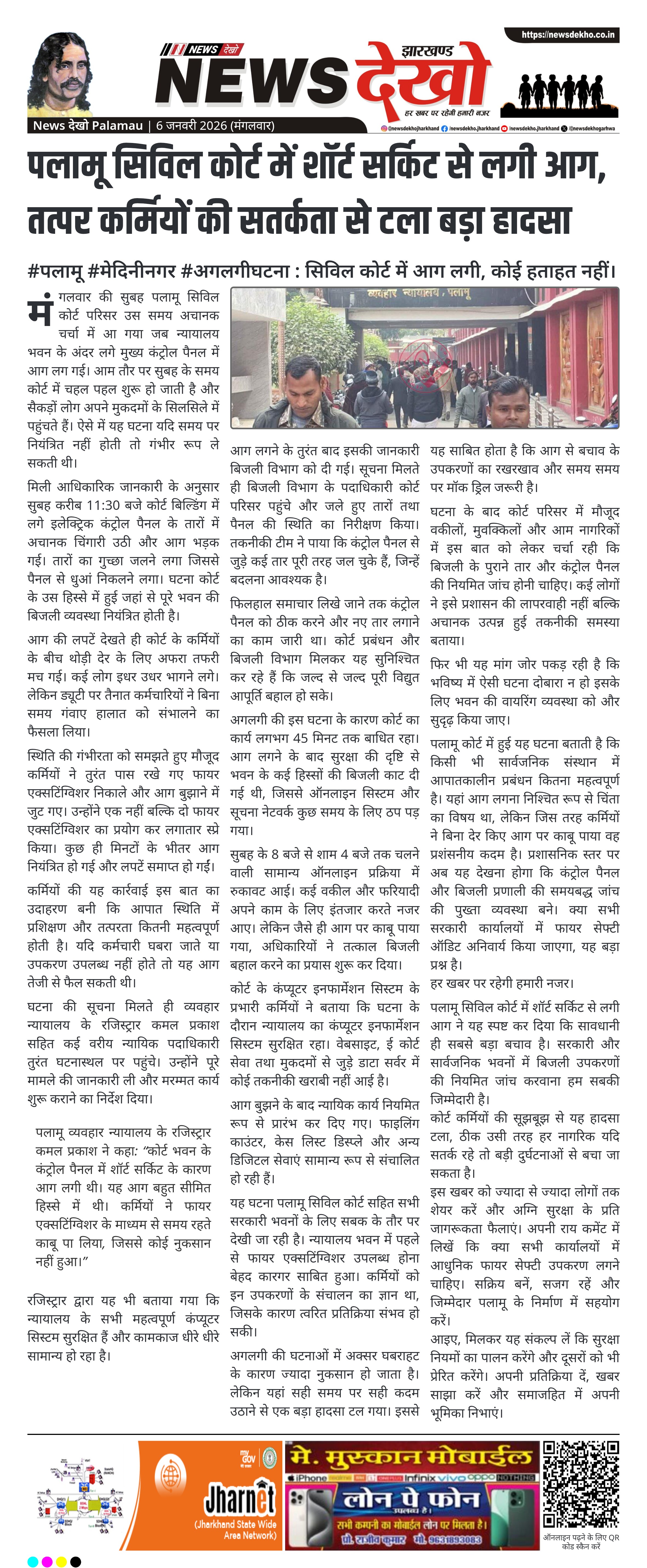 #पलामू #मेदिनीनगर #अगलगीघटना : सिविल कोर्ट में आग लगी, कोई हताहत नहीं। 06 जनवरी 2026 को मंगलवार सुबह की घटना। पलामू सिविल कोर्ट, मेदिनीनगर के कंट्रोल पैनल में लगी आग। आग लगने का मुख्य कारण शॉर्ट सर्किट। कोर्ट के कर्मियों ने दो फायर एक्सटिंग्विशर से काबू पाया। लगभग 45 मिनट…
